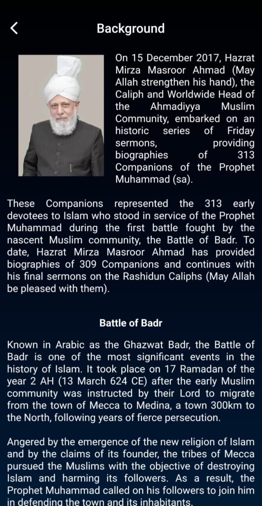 Listen to 20220415-313 companions website app ka ifftatah byAl Fazl International on hearthis.at (مسجد مبارک اسلام آباد، ٹلفورڈ، 08؍اپریل 2022ء) امیرالمومنین حضرت مرزا مسرور احمد خلیفۃ المسیح الخامس ایّدہ اللہ تعالیٰ بنصرہ العزیز نے آج نمازِ جمعہ کے بعد مسجد مبارک سے بدری صحابہؓ سے متعلق ایم ٹی اے انٹرنیشنل کی جانب سے انگریزی زبان میں تیار کردہ ویب سائٹ www.313companions.org اورموبائل فون؍ٹیبلٹ ایپلیکیشن کا اجرا فرمایا اور دعا کروائی۔ دعا سے قبل ویب سائٹ کا معائنہ کرتے ہوئے حضورِ انور نے اس پراجیکٹ کے انچارج محترم آدم واکر صاحب سے استفسار فرمایا کہ کیا یہ ویب سائٹ انگریزی، عربی اور اردو میں ہے۔ اس پر آدم صاحب نے جواب دیا کہ فی الوقت یہ انگریزی اور عربی میں ہے جبکہ اسے اردو زبان میں بھی مہیا کیا جائے گا۔ اس ویب سائٹ کا تعارف کرواتے ہوئے حضرت امیرالمومنین ایّدہ اللہ تعالیٰ بنصرہ العزیز نے اپنے خطبہ جمعہ میں فرمایا: نماز جمعہ کے بعد میں ایم ٹی اے کی ایک سائٹ کا بھی اجرا کروں گا جو ایم ٹی اے انٹرنیشنل نے ویب سائٹ، موبائل ایپلیکیشن بنائی ہے جس میں 313 بدری صحابہؓ کے متعلق میرے خطباتِ جمعہ کو ایک جگہ جمع کیا گیا ہے۔ اس ویب سائٹ پر احباب یہ خطبات جمعہ دیکھنے کے ساتھ ساتھ بدری صحابہؓ کے متعلق بنائی گئی profiles پڑھ سکتے ہیں اور جہاں تک کسی نے مشاہدہ اور مطالعہ کیا ہو گا اس کو bookmark بھی کرسکتے ہیں۔ اس کے علاوہ ہر صحابی کے متعلق سوال و جواب کا ایک کوئز موجود ہے۔ ویب سائٹ پر متعلقہ مفید نقشے بھی دیکھے جاسکتے ہیں۔ ناموں اور مشکل الفاظ کا عربی تلفظ بھی سنا جاسکتا ہے۔ اب تک کی اَپ لوڈ کی گئی معلومات کے علاوہ آئندہ آنے والی نئی معلومات اور ویڈیوز بھی ہر ہفتے اس میںجاری کی جائیں گی ۔ ویب کا جو پتا ہے وہ یہ ہے www.313companions.org۔ تو جیسا کہ میں نے کہا کہ نماز کے بعد اس کا اجرا ہوگا۔ اللہ تعالیٰ اس کو بھی لوگوں کے لیے فائدے کا موجب بنائے۔ ویب سائٹ اور ایپ کے بارے میں کچھ تفصیلات مکرم Adam Walker صاحب، ڈائریکٹر ایم ٹی اے آن لائن نے نمائندہ الفضل انٹرنیشنل کو اس ویب سائٹ کے بارہ میں تفصیلات بتاتے ہوئے کہا کہ چونکہ ایم ٹی اے کا بنیادی مقصد بھی احبابِ جماعت کی تربیت اور غیرازجماعت احباب تک پیغام حق پہنچانا ہے اس لیے جب سے حضورِانور ایدہ اللہ تعالیٰ بنصرہ العزیز بدری صحابہؓ کے متعلق خطباتِ جمعہ ارشاد فرما رہے تھے تب سے ہماری یہ خواہش تھی کہ کوئی ایسا platform مہیا کیا جائے جس پر احمدی احباب اور غیرازجماعت احباب بھی بدری صحابہؓ سے متعلق حضورِانور کے خطباتِ جمعہ تک رسائی حاصل کرسکیں۔ چنانچہ حضورِانور کی منظوری سے اس پراجیکٹ پر کام شروع کردیا گیا۔ اللہ تعالیٰ کے فضل سے ایم ٹی اے آن لائن کی ٹیم نے ایم ٹی اے انٹرنیشنل کے دیگر شعبہ جات کے ساتھ باہمی تعاون سےبڑی محنت سے اس پر کام کیا اور اب اللہ تعالیٰ کے فضل سے حضورِ انور ایّدہ اللہ تعالیٰ بنصرہ العزیز نے اپنے دستِ مبارک سے بدری صحابہؓ کے متعلق www.313companions.org ویب سائٹ اور ایپ کا اجرا فرمایا ہے جو بیک وقت Iphone اور Android وغیرہ پر دستیاب ہے۔ اس ویب سائٹ اور ایپ پر بدری صحابہؓ کے متعلق حضورِانورایدہ اللہ تعالیٰ کے خطباتِ جمعہ اور ان کی ویڈیوز موجود ہیں۔ ویب سائٹ کو سہولت کے لیے بہت سے ذیلی عناوین دیے گئے ہیں۔ اسی طرح ہر بدری صحابی کی الگ سے سوانح حیات بھی ویب سائٹ پر دستیاب ہے۔ ہر صحابی کی سوانح حیات کو مزید ذیلی عناوین میں تقسیم کیا گیا ہے۔ اسی طرح لوگوں کے استفادہ کے لیے مختلف نقشے اور خاکے بھی شامل کیے گئے ہیں۔ مزید برآں صحابہ کرامؓ کے اسمائے مبارکہ نیز بعض ایسے عربی الفاظ جن کا تلفظ قدرے مشکل ہے ان کا صوتی تلفظ بھی شامل کیا گیا ہے جنہیں ایم ٹی اے العربیہ کے تعاون سے تیار کیا گیا ہے۔ اس کے علاوہ ہر سوانح کے آخر پر ایک کوئز بھی تشکیل دیا گیا ہے جس سے زائرین اپنی معلومات کا جائزہ لے سکتے ہیں۔ ویب سائٹ پر بعض صحابہ کرامؓ کے اسمائے مبارکہ پر مشتمل خطاطی کے نمونے بھی دستیاب ہیں۔ محترم آدم واکر صاحب نے مزید بتایا کہ اس ویب سائٹ اور ایپلیکیشن دونوں پر زائرین اپ