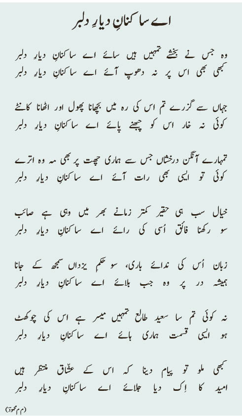 Listen to 20220422-aay saknan e dyar e dilbr ...poem byAl Fazl International on hearthis.at وہ جس نے بخشے تمہیں ہیں سائے اے ساکنانِ دیارِ دلبر کبھی بھی اس پر نہ دھوپ آئے اے ساکنانِ دیارِ دلبر جہاں سے گزرے تم اس کی رہ میں بچھانا پھول اور اٹھانا کانٹے کوئی نہ خار اس کو چبھنے پائے اے ساکنانِ دیارِ دلبر تمہارے آنگن درخشاں جس سے ہماری چھت پر بھی مہ وہ اترے کوئی تو ایسی بھی رات آئے اے ساکنانِ دیارِ دلبر خیال سب ہی حقیر کمتر زمانے بھر میں وہی ہے صائب سو رکھنا فائق اُسی کی رائے اے ساکنانِ دیارِ دلبر زبان اُس کی ندائے باری، سو حکمِ یزداں سمجھ کے جانا ہمیشہ در پر وہ جب بلائے اے ساکنانِ دیارِ دلبر نہ کوئی تم سا سعید طالع تمہیں میسر ہے اس کی چوکھٹ ہو ایسی قسمت ہماری ہائے اے ساکنانِ دیارِ دلبر کبھی ملو تو پیام دینا کہ اس کے عشّاق منتظر ہیں امید کا اِک دیا جلائے اے ساکنانِ دیارِ دلبر (م م محمودؔ)