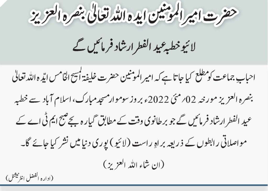 احبابِ جماعت کو مطلع کیا جاتا ہے کہ امیر المومنین حضرت خلیفۃ المسیح الخامس ایّدہ اللہ تعالیٰ بنصرہ العزیز مورخہ 02؍مئی 2022ء بروز سوموار مسجد مبارک، اسلام آباد سے خطبہ عید الفطر ارشاد فرمائیں گے جو برطانوی وقت کے مطابق گیارہ بجے صبح ایم ٹی اے کے مواصلاتی رابطوں کے ذریعہ براہِ راست (لائیو) پوری دنیا میں نشر کیا جائے گا۔ (ان شاء اللہ العزیز)