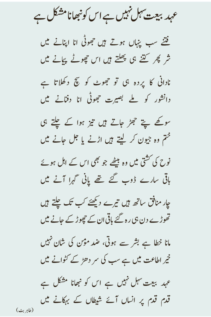 Listen to 20220510-poem .. ehad e baait sahel nahi.. byAl Fazl International on hearthis.at فتنے سب پنہاں ہوتے ہیں جھوٹی انا اپنانے میں شر پھر کتنے ہی پھلتے ہیں اس چھوٹے پیمانے میں نادانی کا پردہ ہی تو جھوٹ کو سچ دکھلاتا ہے دانشور کو ملے بصیرت جھوٹی انا دفنانے میں سوکھے پتے جھڑ جاتے ہیں تیز ہوا کے چلتے ہی ختم وہ جیون کر لیتے ہیں اڑنے یا جل جانے میں نوح کی کشتی میں وہ بیٹھے جو بھی اس کے اہل ہوئے باقی سارے ڈوب گئے تھے پانی گہرا آنے میں چار منافق ساتھ ہیں تیرے دیکھئے کب تک چلتے ہیں تھوڑے دن ہی رہ گئے باقی ان کے چھوڑ کے جانے میں مانا خطا ہے بشر سے ہوتی، ضد مومن کی شان نہیں خیر اطاعت میں ہے سب کی سر دھڑ کے کٹوانے میں عہد بیعت سہل نہیں ہے اس کو نبھانا مشکل ہے قدم قدم پر انساں آئے شیطاں کے بہکانے میں (طاہر بٹ )