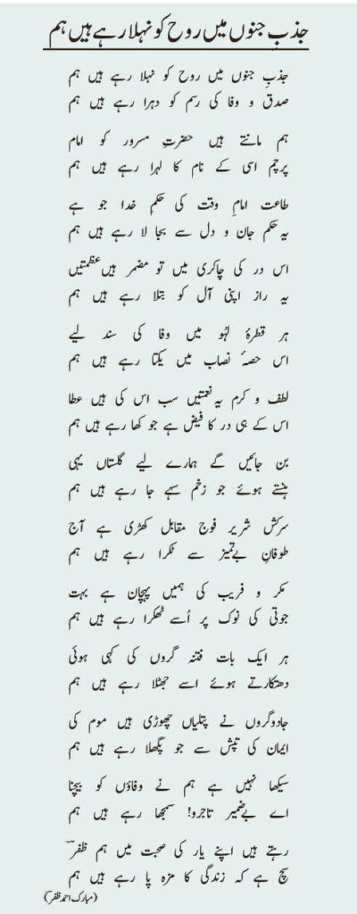 Listen to 20220513-jazb e junoo mn .... poem byAl Fazl International on hearthis.at جذب ِجنوں میں روح کو نہلا رہے ہیں ہم صدق و وفا کی رسم کو دہرا رہے ہیں ہم ہم مانتے ہیں حضرتِ مسرور کو امام پرچم اسی کے نام کا لہرا رہے ہیں ہم طاعت امامِ وقت کی حکمِ خدا جو ہے یہ حکم جان و دل سے بجا لا رہے ہیں ہم اس در کی چاکری میں تو مضمر ہیں عظمتیں یہ راز اپنی آل کو بتلا رہے ہیں ہم ہر قطرۂ لہُو میں وفا کی سند لیے اس حصۂ نصاب میں یکتا رہے ہیں ہم لطف و کرم یہ نعمتیں سب اس کی ہیں عطا اس کے ہی در کا فیض ہے جو کھا رہے ہیں ہم بن جائیں گے ہمارے لیے گلستاں یہی ہنستے ہوئے جو زخم سہے جا رہے ہیں ہم سرکش شریر فوج مقابل کھڑی ہے آج طوفانِ بےتمیز سے ٹکرا رہے ہیں ہم مکر و فریب کی ہمیں پہچان ہے بہت جوتی کی نوک پر اُسے ٹھکرا رہے ہیں ہم ہر ایک بات فتنہ گروں کی کہی ہوئی دھتکارتے ہوئے اسے جھٹلا رہے ہیں ہم جادوگروں نے پتلیاں چھوڑی ہیں موم کی ایمان کی تپش سے جو پگھلا رہے ہیں ہم سیکھا نہیں ہے ہم نے وفاؤں کو بیچنا اے بےضمیر تاجرو! سمجھا رہے ہیں ہم رہتے ہیں اپنے یار کی صحبت میں ہم ظفرؔ سچ ہے کہ زندگی کا مزہ پا رہے ہیں ہم (مبارک احمد ظفرؔ)