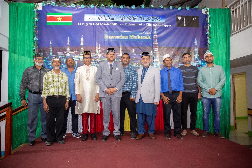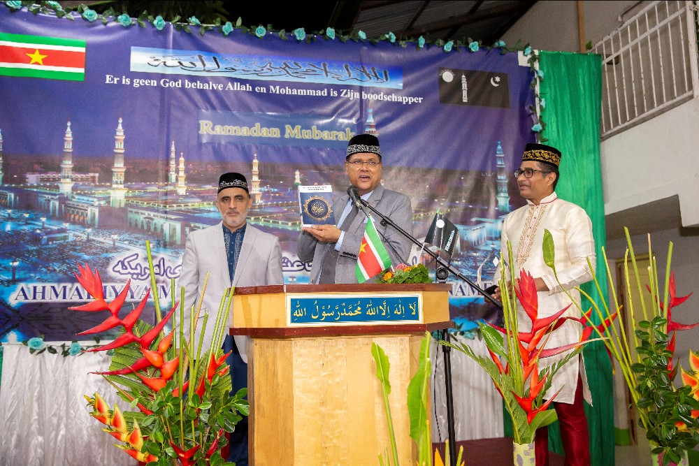 جماعتی تاریخ میں پہلی بار صدر جمہوریہ کی مسجد آمد اور افطار میں شرکت الیکٹرانک اور پرنٹ میڈیا میں جماعتی خبروں کی اشاعت ماہ صیام اپنی تمام تر رعنائیوں کے ساتھ اپریل کے پہلے ہفتے میں جنوبی امریکہ کے ممالک پر سایہ فگن ہوا۔ امسال یہ ماہِ مقدس اس لیے بھی یاد گار تھا کہ جماعتی تاریخ میں پہلی بار ملک کے صدر تین وزراء کے ہمراہ افطار میں شرکت کے لیے مسجد ناصر میں تشریف لائے۔ خدا تعالیٰ کے فضل و احسان سے جماعت احمدیہ سُرینام کو دسمبر 2001ء سے رمضان المبارک کے مقدس مہینہ میں روزانہ پندرہ منٹ کا ایک ٹی وی پروگرام پیش کرنے کی توفیق مل رہی ہے اور اس ملک کے ٹی وی چینلز مذہبی رواداری کی عمدہ مثال قائم کرتے ہوئے ان پروگرامز کے لیے حسب منشا وقت بھی دیتے ہیں اور معاوضہ بھی انتہائی مناسب لیتے ہیں۔ امسال بھی ہم نے مارچ کے شروع میں مختلف ٹی وی چینلز سے رابطے کیے، تو ٹی وی پر پندرہ منٹ وقت کا کمرشل ریٹ 350سُرینامی ڈالربتایا گیا۔ اس پر ملک کے معروف ٹی وی چینل (T.B.N) ’’تری شول براڈکاسٹنگ نیٹ ورک‘‘ کے مالک سے رابطہ کیا گیا اور معاوضے میں کمی کی بات کی۔ موصوف نے کہا کہ میں چاہتا ہوں کہ آپ میرے چینل سے اپنے پروگرام دیں، اور فی پروگرام آپ جو معاوضہ ادا کرسکتے ہیں وہ ہمیں بتا دیں۔ چنانچہ خدا تعالیٰ کے فضل سے اس چینل نے صرف 80سُرینامی ڈالرز فی پروگرام معاوضے پر شام چھ بجے کا وقت دینے کی حامی بھری۔ حضور انور ایدہ اللہ تعالیٰ بنصرہ العزیز کی خدمت اقدس میں دعاکی درخواست کے بعد ہم نے پروگرامز کی تیاری اور ترتیب و تدوین کا کام شروع کیا اور بفضل خدا یکم اپریل کو پہلا پروگرام ’’رویت ہلال‘‘ کے حوالے سے نشر ہوا۔ ماہِ مقدس کا آغاز مورخہ 2؍اپریل 2022ء بروز ہفتہ پہلی تراویح ادا کی گئی اور اتوار 3؍اپریل کو سرینام میں مسلمانوں کی اکثریت نے پہلا روزہ رکھا۔ رمضان المبارک کے آغاز سے ایک ہفتہ پہلے سحرو افطار کا ٹائم ٹیبل تیار کرکے افراد جماعت میں تقسیم کیا گیا۔ خداتعالیٰ کے فضل اور رحم کے ساتھ دوسال بعد جماعت کی دونوں مساجد میں صلوٰۃ خمسہ کے ساتھ نمازتراویح کا انتظام کیا گیا۔ روزانہ درس حدیث اور سوال وجواب کی مجلس بھی منعقد ہوتی رہی۔ دوسال گھروں میں رہنے کے بعد افراد جماعت بہت ذوق و شوق اور جذبے کے ساتھ مسجد آتے رہے۔ خاکسار (مبلغ سلسلہ) کے علاوہ چار افراد نےمختلف دنوں میں نماز تراویح پڑھائی۔ اجتماعی افطار رمضان المبارک کے آغاز میں ہی مسجد میں افطار کیلنڈر آویزاں کر دیا جاتا ہے، اور احباب جماعت اپنی سہولت کے مطابق دن منتخب کرکے سامنے اپنا نام لکھ دیتے ہیں۔ خدا تعالیٰ کے فضل سے امسال افراد جماعت کی طرف سےمسجد ناصر میں دس اجتماعی افطاریوں کا انتظام کیا گیا، جن میں حاضری80سے 100کے درمیان رہی۔ افطار کا انتظام کرنے والوں نے بڑی فراخ دلی سے افطار ی کے لیے مختلف لوازمات اور کھانے کا انتظام کیا۔ گذشتہ کئی سالوں سے ہم نے یہ اصول وضع کیا ہوا ہے کہ افطار کے فوراً بعد نماز مغرب ادا کی جاتی ہے۔ اور عشاء کی نماز تک شاملین مسجد میں وقت گذارتے ہیں۔ نماز عشاء اور تراویح کی ادائیگی کے بعد تمام احباب کی خدمت میں کھانا پیش کیا جاتا ہے۔ امسال رمضان المبارک کی آخری اجتماعی افطاری کا اہتمام مورخہ 29؍اپریل کو مسجد نصر میں کیا گیا۔ اس افطاری کے حوالے سے ایک دلچسپ واقعہ بھی پیش آیا۔ جماعت کے ایک ممبر جو باقاعدگی سے جنگل میں شکار کے لیے جاتے ہیں گذشتہ کئی سال سے اس خواہش کا اظہار کرتے آرہے تھے کہ اگر ہرن مل جائے تو افطاری کے کھانے کے لیے پیش کروں گا۔ امسال حسن اتفاق سے چند منٹ کے وقفے سے انہوں نے دو صحت مند ہرن شکار کیے، جن کے 25کلو گوشت سے تمام شاملین کی تواضع کی گئی۔ صدر جمہوریہ کی آمد رمضان المبارک کے آغاز میں ہی صدر مملکت کے دفتر کی طرف سے مشن ہاؤس فون کرکے اس بات کی اطلاع دی گئی کہ صدر جمہوریہ چودہ اپریل کو مسجد آئیں گے۔ چنانچہ افراد جماعت نے معزز مہمان کے اس دورے کو یادگار بنانے کے لیے بہت محنت سے کام کیا۔ مجلس عاملہ کے متعدد اجلاس ہوئے اور تمام انتظامات کو حتمی شکل دی گئ