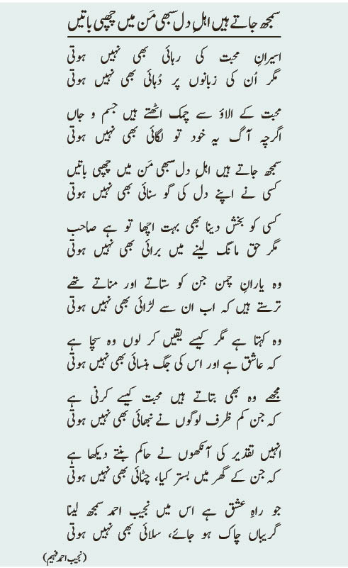 Listen to 20220517- samj jaty hn....(poem) byAl Fazl International on hearthis.at اسیرانِ محبت کی رہائی بھی نہیں ہوتی مگر اُن کی زبانوں پر دُہائی بھی نہیں ہوتی محبت کے الاؤ سے چمک اٹھتے ہیں جسم و جاں اگرچہ آگ یہ خود تو لگائی بھی نہیں ہوتی سمجھ جاتے ہیں اہلِ دل سبھی مَن میں چھپی باتیں کسی نے اپنے دل کی گو سنائی بھی نہیں ہوتی کسی کو بخش دینا بھی بہت اچھا تو ہے صاحب مگر حق مانگ لینے میں برائی بھی نہیں ہوتی وہ یارانِ چمن جن کو ستاتے اور مناتے تھے ترستے ہیں کہ اب ان سے لڑائی بھی نہیں ہوتی وہ کہتا ہے مگر کیسے یقیں کر لوں وہ سچا ہے کہ عاشق ہے اور اس کی جگ ہنسائی بھی نہیں ہوتی مجھے وہ بھی بتاتے ہیں محبت کیسے کرنی ہے کہ جن کم ظرف لوگوں نے نبھائی بھی نہیں ہوتی انہیں تقدیر کی آنکھوں نے حاکم بنتے دیکھا ہے کہ جن کے گھر میں بستر کیا، چٹائی بھی نہیں ہوتی جو راہِ عشق ہے اس میں نجیب احمد سمجھ لینا گریباں چاک ہو جائے، سلائی بھی نہیں ہوتی (نجیب احمد فہیم)