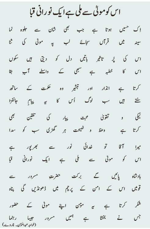 Listen to 20220520-poem..eik haseen hota hy shan sy.. byAl Fazl International on hearthis.at اِک حسیں ہوتا ہے جب بھی شان سے جلوہ نما سینہ میں قرآں سجائے لب پہ مولیٰ کی ثنا اس کی پُر تاثیر باتیں دل کو دیتی ہیں سکوں اس کا خطبہ ہے سبھی کے واسطے آبِ بقا کرتا ہے انذار اور تبشیر وہ حکمت کے ساتھ سنتے ہیں سب لوگ اُس کا یہ پیامِ جانفزا نیکی و تقویٰ محبت پیار کی تلقین بھی کرتا ہے وعظ و نصیحت ہر گھڑی سب کو سدا میرا آقا تو خدائی نور سے بھرپور ہے اس کو مولیٰ سے ملی ہے ایک نورانی قبا بادشاہ پائیں گے برکت حضرتِ مسرور سے قومیں اس کے امن کے پرچم میں ڈھونڈیں گی پناہ شکر کرتا ہے یہ مومن اپنے مولیٰ کے حضور جس نے بخشا ہے ہمیں مسرور جیسا رہنما (خواجہ عبدالمومن۔ ناروے)