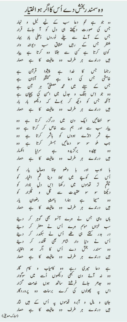 Listen to 20220527-poem mubarak siddiqui sb byAl Fazl International on hearthis.at وہ جو ہے محوِ دعا سب کے لیے لیل و نہار جس کی صورت دیکھتے ہی دل کو آ جائے قرار جس کے آنے سے چلے نوروں دُھلی بادِ بہار منتظر جس کے رہیں عشاق سب دیوانہ وار کون کرتا ہے کسی سے جتنا وہ کرتا ہے پیار ہیں درندے ہر طرف وہ عافیت کا ہے حصار رہنما جس کا خدا ہے پیشوا قرآن ہے خامشی جس کی دعا ہے گفتگو آذان ہے جس کے سینے میں محمد مصطفیٰؐ ہر آن ہے وہ جو اِس جنگ و جدل میں امن کی پہچان ہے آنکھ جس کو دیکھ کر بولے کہ دیکھو بار بار ہیں درندے ہر طرف وہ عافیت کا ہے حصار سو خطائیں ایک دن میں درگزر کرتا ہے وہ پیار سب سے اور ہم سے خاص کر کرتا ہے وہ بے ثمر اجڑے ہووں کو باثمر کرتا ہے وہ جب ملو سو سو دعائیں ہمسفر کرتا ہے وہ وہ چنیدہ برگزیدہ ہے سراپا انکسار ہیں درندے ہر طرف وہ عافیت کا ہے حصار با ادب اور با وضو جانا وصالِ یار کو اُس کے کوچے میں بھلا دینا غمِ اغیار کو چشمِ تر قدموں میں رکھنا اِس دلِ نادار کو دیکھنا سو سو عقیدت سے گُل و گُلزار کو وہ مسیحا ہے ہمارا باعثِ رضوانِ یار ہیں درندے ہر طرف وہ عافیت کا ہے حصار ہاں وہی جس نے مِرے آنسو بھی گوہر کر دئیے سب خزاں موسم مِرے اُس نے معطر کر دئیے در بدر کتنے ہی تھے اُس نے سِکندر کر دئیے اُس نے دنیا دار شاعر بھی قلندر کر دئیے وہ سمندر بخش دے اُس کا اگر ہو اختیار ہیں درندے ہر طرف وہ عافیت کا ہے حصار ہے دعا میری رہے وہ کامیاب و کام گار وہ نہ آئے دن کبھی دیکھوں اُسے میں سوگوار وہ جدھر جائے فرشتے ساتھ ہوں خدمت گزار اس پہ پھولوں کی کرے برسات وہ پروردگار جان و مال و آبرو قدموں پہ اُس کے ہیں نثار ہیں درندے ہر طرف وہ عافیت کا ہے حصار (مبارک صدیقی )