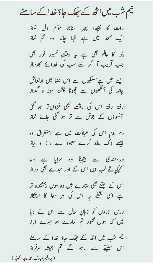 Listen to 20220610-poem. neem shab mn uth .... byAl Fazl International on hearthis.at رات کا پچھلا پہر، سناٹا، موسم دل نواز ایک مسجد میں ہے تنہا چاند وہ محوِ نماز ہُو کا عالم بھی ہے یہ وقتِ ظہورِ نور بھی جب قریب آ کر سُنے سب کی خدائے کارساز ایسے میں ہے سسکیوں سے اس فضا میں ارتعاش چاند کی آنکھوں سے پُھوٹا چشمۂ سوز و گداز رفتہ رفتہ اس کی رقّت بھی فزوںتر ہو گئی آنسوؤں کے جوش سے تر ہو گئی جائے نماز دم بدم اس کی عبادت میں ہے استغراق وہ جیسے اِک عابد کرے معبود سے راز و نیاز دردمندی سے یقیناً وہ سراپا ہے دعا کپکپاتے لب ہیں اس کے اور سجدے بھی دراز اس کے جتنے بھی ستارے ہیں وہ ہوں رخشندہ تر ہے اسی نقطے پہ اس کی ہر دعا کا ارتکاز درس تاروں کو زبانِ حال سے اس نے دیا مَیں کہ ہوں محمود تم سارے بنو میرے ایاز نیم شب میں اٹھ کے جھک جاؤ خدا کے سامنے اس سلیقے سے رہو گے تم ہمیشہ سرفراز ( پروفیسر مبارک ا حمد عابد، کینیڈا)