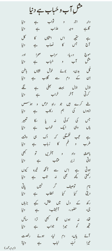 دارِ اجر و ثواب ہے دنیا گاہے وجہِ عذاب ہے دنیا ہے نتیجہ اس امتحاں کا کل آج جس کا نصاب ہے دنیا موجِ دریا، سرابِ صحرا اور مثلِ آب و حَباب ہے دنیا گُل بدن، بوئے خوش فِشاں باطن اِن کے دم سے گلاب ہے دنیا اوّل اوّل بہت بھلی ہے لگے کرتی آخر خراب ہے دنیا طے کرے ہیں جو راہِ حرص و ہوَس ایسوں کی ہم رکاب ہے دنیا جس کی کوئی نہ پا سکا تعبیر ہاں وہی ایک خواب ہے دنیا ہے عجب نغمگی کہ اک ہی وقت طرب و غم کا رُباب ہے دنیا باعثِ داد و آفریں تو کبھی لاتی زیرِ عتاب ہے دنیا ہوتی ہے اِس سے آنکھ خیرہ کیوں رکھتی کچھ بھی نہ تاب ہے دنیا نامِ توصیف گر نہیں پاتی دیتی کیا کیا خطاب ہے دنیا رکھ کے دل میں خلش، کہے بزباں جی، حضور، آنجناب، ہے دنیا تھا، نہ ہوں گا کبھی ترا سائل تجھ کو میرا جواب ہے دنیا آئے یاں، دم لیا، ہوئے رخصت تیرا لُبِّ لباب ہے دنیا! (م۔ م۔ محمود)