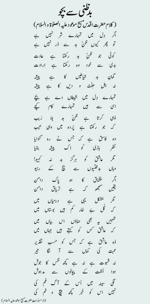 (کلام حضرت اقدس مسیح موعود علیہ الصلوٰۃ و السلام) اگر دِل میں تمہارے شر نہیں ہے تو پھر کیوں ظنِّ بد سے ڈر نہیں ہے کوئی جو ظنِّ بد رکھتا ہے عادت بدی سے خود وہ رکھتا ہے اِرادت گمانِ بد شیاطیں کا ہے پیشہ نہ اہلِ عِفّت و دیں کا ہے پیشہ تمہارے دِل میں شیطاں دے ہے بچے اسی سے ہیں تمہارے کام کچے وُہی کرتا ہے ظنِّ بد بِلا رَیب کہ جو رکھتا ہے پَردہ میں وہی عیب وہ فاسق ہے کہ جس نے رہ گنوایا نظر بازی کو اِک پیشہ بنایا مگر عاشق کو ہرگز بد نہ کہیو! وہاں بدظنّیوں سے بچ کے رہیو اگر عُشّاق کا ہو پاک دامن یقیں سمجھو کہ ہے تریاق دامن مگر مُشکل یہی ہے درمیاں میں کہ گُل بے خار کم ہیں بوستاں میں تمہیں یہ بھی سُناؤں اس بیاں میں کہ عاشق کِس کو کہتے ہیں جہاں میں وُہ عاشِق ہے کہ جس کو حسبِ تقدیر محبت کی کماں سے آ لگا تِیر نہ شہوت ہے نہ ہے کچھ نفس کا جوش ہوا اُلفت کے پیمانوں سے مدہوش لگی سینہ میں اُس کے آگ غم کی نہیں اس کو خبر کچھ پیچ و خم کی (از مسوّدات حضرت مسیح موعودعلیہ السلام )