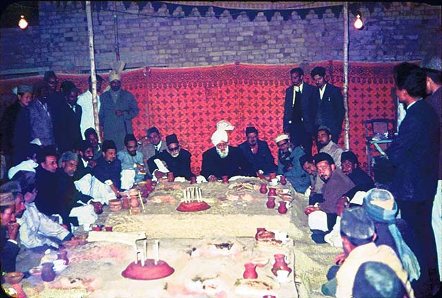 جلسہ سالانہ کے اختتام کے بعد کارکنان و انتظامیہ کے اعزاز میں ہر سال 30 یا 31 دسمبر کو لنگر خانہ نمبر 1 میں عشائیہ منعقد کیا جاتا تھا ۔ زیر نظر تصویر میں حضرت خلیفہ المسیح الثالث رحمہ اللہ تعالیٰ زمین پر بیٹھ کر احباب کو برکت بخش رہے ہیں۔ یہ دراصل چولہے ہیں جن کو بطور میز تیار کیا گیا ہے، تصویر میں جلسے کے موقعے پر استعمال ہونے والے آب خورے اور مٹی کے برتن بھی موجود ہیں۔تصویر میں: صوفی بشارت الرحمٰن صاحب۔ حضرت صاحبزادہ مرزا طاہر احمد صاحب(خلیفۃ المسیح الرابعؒ)۔ محترم نواب منصور احمد خان صاحب۔ محترم منیر احمد بسمل چٹھہ صاحب۔ حضرت خلیفہ المسیح الثالث رحمہ اللہ۔ حضرت صاحبزادہ مرزا عزیز احمد صاحب۔ حضرت صاحبزادہ مرزا منصور احمد صاحب۔حضرت صاحبزادہ ڈاکٹر مرزا منور احمد صاحب۔محترم ظہور احمد باجوہ صاحب۔پروفیسر نصیر احمد خان صاحب۔ دسمبر کا مہینہ آتے ہی ربوہ اور قادیان میں جلسہ کی آمد آمد ہوتی تھی۔ لوگ جلسہ سالانہ میں شرکت کے لیے تیاری تو بہت عرصہ پہلے شروع کر دیتے تھے۔ لیکن دسمبر میں جلسہ کی تیاریاں عروج پر پہنچ جاتی ہیں۔ خاکسار نے اپنی ہوش میں پہلا جلسہ سالانہ ربوہ میں 1966ء میں دیکھا جب جامعہ میں داخل ہوا تھا اس کے بعد سے لگاتار خداتعالیٰ کے فضل سے 1977ء تک ربوہ کے جلسوں میں شرکت اور خدمات انجام دینے کی سعادت ملتی رہی۔ ربوہ کے جلسہ سالانہ کی جہاں علمی، روحانی افادیت ہوتی ہے اور ان مقاصد کو پورا کرنے والا ہوتا ہے جو حضرت مسیح موعودؑ نے فرمائے ہیں وہاں پر اس میں شامل ہونا بھی ایک لذت اور سرور پیدا کرتا ہے۔ جلسہ سالانہ کے دنوں میں مجھے یاد ہے کہ ربوہ میں ہر طرف گہما گہمی، خوشی کی لہر اور تیاری ہو رہی ہوتی تھی۔ ربوہ کی سڑکوں، گلیوں میں وقار عمل، صفائیاں اور پھر ربوہ کے مختلف اطراف میں بڑے بڑے گیٹ بنائے جاتے تھے جن پر اھلاً و سھلاً و مرحبًا لکھا ہوتا تھا اور کہیں ’جی آیاں نوں‘ اور کہیں ’خوش آمدید‘ کے الفاظ ہوتے تھے۔ بڑے تو ڈیوٹیاں دیتے ہی تھے بچے بھی کسی سے پیچھے نہ ہوتے تھے۔ بچوں کے اندر بھی ڈیوٹیوں کا جذبہ سردی کی پرواہ کیے بغیر خصوصاً صبح کو نماز تہجد کے وقت صَلِّ عَلَی نَبِیِّنَا صَلِّ عَلَی مُحَمَّدٍکی پُرسوز آواز میں ربوہ کے چاروں اطراف میں ایک عجیب روحانی لذت پیدا کرتا تھا اور لوگ جوق در جوق اپنی اپنی مساجد میں نماز تہجد اور نماز فجر اور درس کے لیے پہنچ جاتے تھے۔ مسجد مبارک تو بالکل بھر جاتی تھی، قناتیں لگتی تھیں، عجیب روحانی منظر ہوتا تھا۔ ربوہ کے تمام کالج، سکول، جامعہ بند ہو جاتے تھے۔ ان عمارتوں کے کمرے جلسہ کے مہمانوں کے لیے رہائشی کمرے بن جاتے تھے۔ بیت الخلا کا بھی الگ انتظام ہوتاتھا۔ ہر گھر میں 20-25 مہمانوں کا ہونا تو عام سی بات ہے مجھے یاد ہے اور کئی دفعہ دوستوں سے بات ہوتی تھی کہ گھروں میں 40-50سے بھی زائد مہمان ٹھہرے ہوتے تھے۔ اور بعض کے گھروں میں تو بالکل گنجائش نہ ہوتی تو صحن میں چھولداری لگادی جاتی جس میں عموماً صاحب البیت اپنے کنبے کے ہمراہ قیام کرتے جبکہ مہمانوں کی خدمت میں گھروں کے کمرے پیش کر دیے جاتے تھے۔ مہمان بھی نیچے پرالی بچھے فرش پر گدے ڈال کر سونے کو غنیمت جانتے تھے۔ ناظم صاحب پرالی بھی اس بات کو یقینی بناتے تھے کہ جہاں جہاں چھولداریاں لگی ہیں خواہ گھروں میں ہی کیوں نہ ہوں وہاں پرالی پہنچ جائے تا وہاں رہنے والوں کو سہولت میسر آ سکے۔ اس پرالی پر سونے کا بھی عجیب مزا ہوتا تھا۔ گھر کے بچے علی الصبح نماز سے فراغت کے بعد خوراک کی پرچی لے کر لنگرخانے میں جا کر مہمانوں کے لیے کھانا لاتے اور جلسہ شروع ہونے سے قبل ہزاروں لوگ ناشتے وغیرہ سے فارغ ہو کر جلسہ گاہ پہنچ جاتے۔ جو مہمان کچھ بیمار ہوتے اور وہ دال روٹی نہ کھا سکتے تو ان کے لیے الگ لنگر پرہیزی چلتا جہاں پر چاول، دال یا آلو گوشت ملتا تھا۔ شعبہ استقبال جامعہ احمدیہ کے تمام ہی طلباء کی ڈیوٹیاں جلسہ کے مہمانوں کی خدمت کے لیے لگتی تھیں۔ چنانچہ میری سب سے پہلی ڈیوٹی شعبہ استقبال میں لگی۔ اس کے ناظم محترم مولانا ابوالمنیرنورالحق صاحب مرحوم 