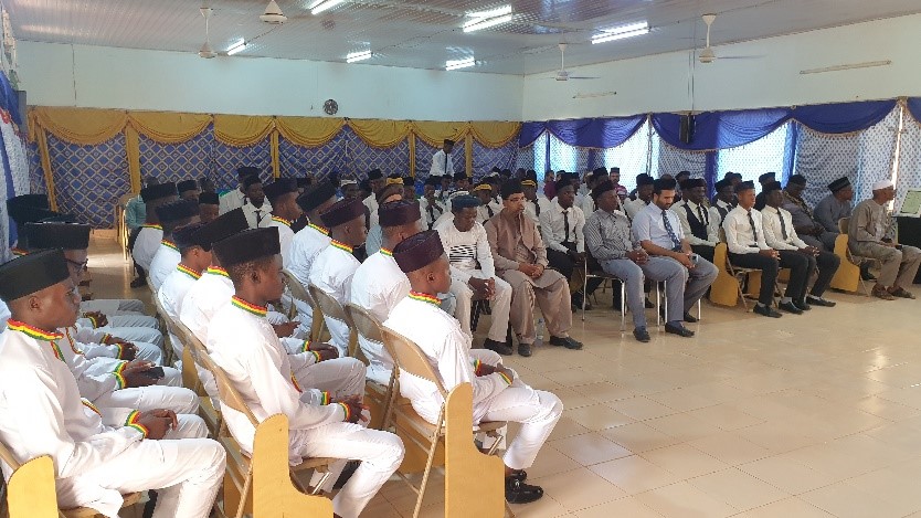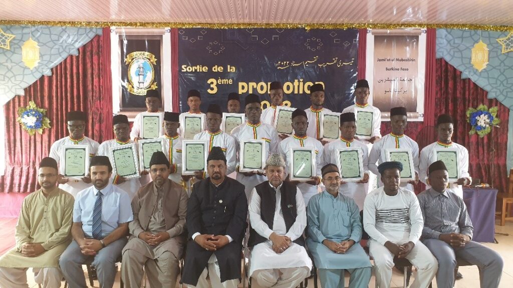 اللہ تعالیٰ کے فضل سے برکینافاسو میں جامعۃ المبشرین کی ابتدا 2017ء میں ہوئی۔ اس جامعہ میں فرنچ ممالک سے تعلق رکھنے والے طلباء تعلیم کے لیے آتے ہیں۔یہ پہلا اور منفرد جامعہ احمدیہ ہے جو مکمل فرنچ میڈیم ہے۔ اس وقت اللہ تعالیٰ کے فضل نو ممالک کے60طلباء جامعۃ المبشرین میں پڑھ رہے ہیں۔ ان میں برکینافاسو، بینن، نائیجر، مالی، کانگو کنشاسا، کانگو برازاویل، سینیگال، گنی کناکری اور سینٹرل افریقہ کے طلباء شامل ہیں۔ اس سال جامعۃ المبشرین سے تیسر ی کلاس فارغ التحصیل ہوئی ہے۔ پہلے سال 18، دوسرے سال 16 اور اس سال 15 مبلغین جامعۃ المشرین سے فارغ التحصیل ہوئے ہیں۔ اس طرح اب تک چھ ممالک کے کل 49 مبلغین اس جامعہ کو تیار کرنے کی توفیق عطا ہوئی ہے جن کی ملک وار تفصیل یہ ہے۔ برکینافاسو: 21 بینن: 13 مالی: 8 نائیجر: 3 کانگو کنشاسا: 3 کانگو برازاویل: 1 کل: 49 سال 2021-2022ء کی مختصر کار گزاری رپورٹ علمی مقابلہ جات جامعہ کے طلباء کی علمی صلاحیتیں بڑھانے کے لیے ہر سال مجلس علمی کے تحت مختلف مقابلہ جات کروائےجاتے ہیں۔ دوران سال 16مقابلہ جات کروائے گئے جن میں تلاوت، نظم، اذان، پیغام رسانی، عربی فرنچ اور اردو میں تقاریر کے مقابلہ جات، فرنچ زبان، اردو اور عربی میں فی البدیہہ تقریر، خطبات امام، حفظ قرآن، حفظ ادعیہ، حفظ حدیث، قصیدہ، مشاہدہ معائنہ اور لطائف کے مقابلہ جات شامل تھے۔ ورزشی مقابلہ جات جامعہ میں طلباء کی جسمانی صحت برقرار رکھنے کے لیے روزانہ باقاعدگی سے کھیلو ں کا انعقاد کیا جاتا ہے۔ نیز ہر سال تین دنوں کے لیے سالانہ ورزشی مقابلہ جات کا انعقاد کیا جاتا ہے۔ ان مقابلہ جات میں فٹ بال، کرکٹ، والی بال، رسہ کشی، باڑی، ثابت قدمی،پنجہ آزمائی، دوڑ 100 میٹر، نشانہ غلیل، ہائی جمپ، لانگ جمپ، تین ٹانگ دوڑ، بوری ریس، ریلے ریس، کلائی پکڑنا، تیز چلنا دس کلومیٹر اور روک دوڑ کے مقابلہ جات شامل ہیں۔ مجلس ارشاد جامعہ میں ہر سال مجلس ارشاد کے تحت مختلف علمی و تربیتی سیمینارز اور جلسہ جات منعقد کیے جاتے ہیں۔ چنانچہ اس سال مندرجہ ذیل پروگرام منعقد کرنے کی توفیق ملی۔ جلسہ سیرۃالنبیﷺ، جلسہ یوم مسیح موعود، جلسہ یوم مصلح موعود، جلسہ یوم خلافت نیز برکینافاسو کی یوم آزادی کے موقع پر بھی پروگرام منعقد کیا گیا۔ وقار عمل وقار عمل جماعت احمدیہ کا طر امتیاز رہا ہے۔ جامعۃ المبشرین کے طلباء میں بھی وقار عمل کی روح پیدا کرنے کے لیے باقاعدگی سے وقار عمل کا انعقاد کیا جاتا ہے۔ چنانچہ طلباء کی وقار عمل میں مساعی کی جھلک واضح طور پر برکینافاسو کے جلسہ سالانہ اوراجتماع خدام الاحمدیہ پر نظر آتی ہے جس میں طلباء بے لوث ہوکر دن رات وقار عمل کرکے تمام انتظامات کرتے ہیں اور حضرت مسیح موعودؑ کے مہمانوں کی مدارت میں کوئی کمی نہیں آنے دیتے۔ تبلیغ دوران سال تین دفعہ شہر کے مختلف حصوں میں طلباء نے پانچ ہزار کی تعدادمیں پمفلٹ تقسیم کیے۔ اسی طرح واگہ ڈوگو میں اس سال ایک کتابی میلہ لگا جس میں جماعت کا سٹال بھی لگایا گیا اس میں طلباء نے دو لاکھ فرانک سیفا کی جماعتی کتب فروخت کیں۔ وقف عارضی جماعت کی تاریخ میں وقف عارضی کی بھی اپنی جگہ اہمیت ہے۔ چنانچہ ہر سال چھٹیوں میں جامعہ کے طلباء کو مختلف جماعتوں میں وقف عارضی کے لیے بھیجا جاتا ہے۔ چنانچہ جہاں اس سے طلباء کو فیلڈ کا تجربہ ہوتا ہے وہاں جماعتیں بھی اس سے فائدہ اٹھاتی ہیں۔ خدام و اطفال و انصار کی تربیتی کلاسز کاانعقاد کیا جاتا ہے اور تبلیغی پروگرام بھی بنائے جاتے ہیں۔ اس سال فارغ التحصیل ہونے والی کلاس دو بار وقف عارضی کے بابرکت پروگرام میں شرکت کرچکی ہے۔ خدمت خلق رمضان المبارک کے مہینہ میں طلباء کی طرف سے بستان مہدی کے سامنے سےگزرنے والی گھانا-برکینافاسو ہائی وے پر مسافروں کے لیے افطاری کے وقت ٹھنڈے پانی کا انتظام کیا گیا۔ اور روزانہ دو صد پیکٹ تقسیم کیے۔ اس کے علاوہ عید الفطر پر جامعۃ المبشرین کے گردو نواح میں رہنے والوں میں چینی اور چاول کے تحائف تقسیم کیے گئے نیز عید الاضحی کے موقع پر گوشت تقسیم کیا گیا۔ تقریب تقسیم اسناد