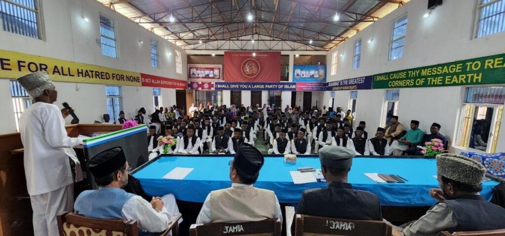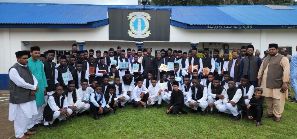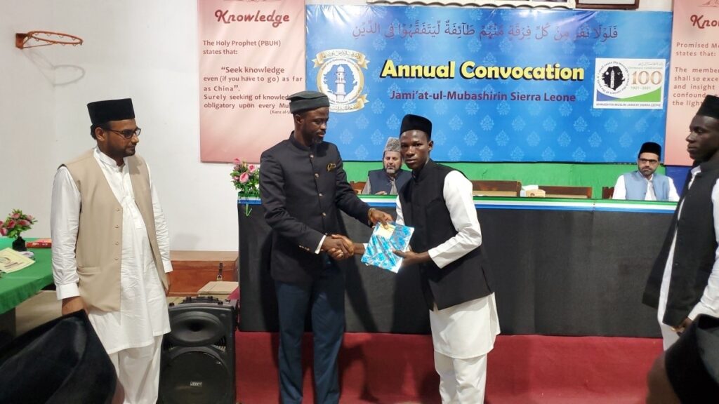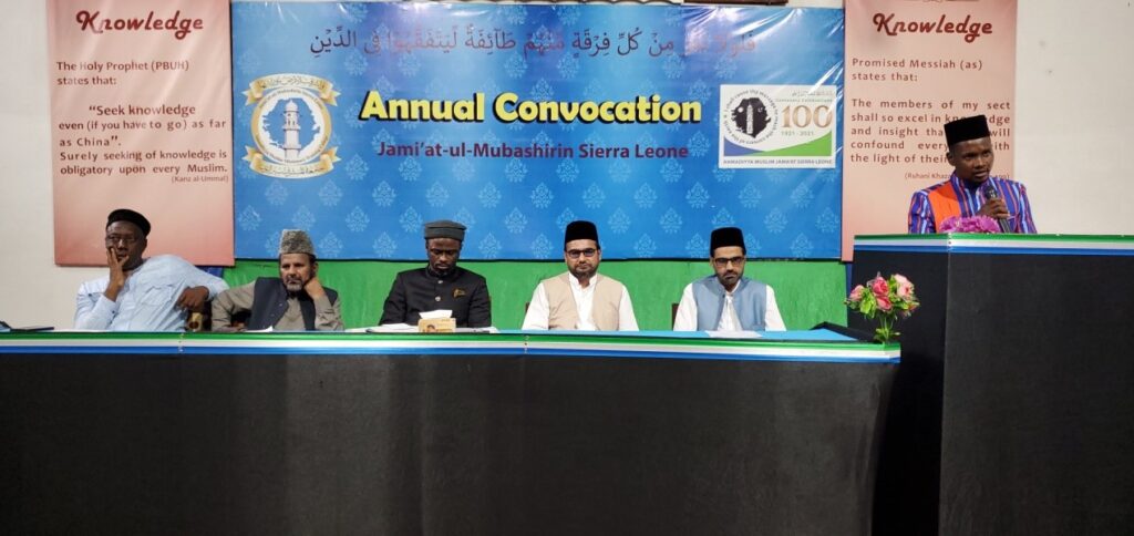 محض اللہ تعالیٰ کے فضل سے جامعۃ المشرین سیرالیون کو مورخہ 31؍جولائی 2022ء کو اپنی سالانہ تقریبِ تقسیمِ انعامات منعقد کرنے کی توفیق ملی۔ الحمد للہ اس روز امیر جماعت سیرالیون مکرم موسیٰ میوا صاحب دن دس بجے اپنے وفد کے ہمراہ جامعۃ المبشرین سیرالیون پہنچے جہاں جامعہ کے طلباء، پرنسپل صاحب اور اساتذہ نے آپ کو خوش آمدید کہا۔ آپ نے جامعہ کے سٹاف کے ساتھ ایک میٹنگ کی جس میں اس سال ہونے والے امتحانات اور طلباء کی کارکردگی اور جامعہ کے دیگر امور کا جائزہ لیا گیا۔ میٹنگ کے بعد تقریبِ تقسیمِ انعامات کا باقاعدہ آغاز مکرم امیر صاحب کی صدارت میں دن بارہ بجے جامعۃ المبشرین کے ہال میں تلاوتِ قرآنِ کریم و ترجمہ سے ہوا۔ عزیزم محمد ییرو کمارا صاحب نے تلاوت و ترجمہ پیش کیا۔ مکرم امیر صاحب کے ساتھ سٹیج پر مولانا سعیدالرحمٰن صاحب مبلغ انچارج، مکرم مبارک احمد گھمن صاحب پرنسپل جامعہ، مکرم عقیل احمد صاحب ریجنل مبلغ اور مکرم اسماعیل نالو صاحب صدر جماعت بو ریجن بھی موجود تھے۔ تلاوت کے بعد عزیزم علی بی کانو اور ان کی ٹیم نے ایک اردو نظم پیش کی۔ جس کے بعد مکرم الحاجی نذیر علی کمانڈا بونگے صاحب نے امیر صاحب اور ان کے ساتھ آنے والے مہمانان کا تعارف کروایا۔ مکرم پرنسپل صاحب جامعہ نے تمام مہمانان کو خوش آمدید کہا اور عربی میں بولے جانے والے الفاظ اھلا و سھلا و مرحبا کے معنی بیان کیے۔ ا س کے بعد مولوی سلیمان حمزہ کمارا صاحب استاذ جامعہ نے سالانہ رپورٹ پیش کی۔ مختصر سالانہ رپورٹ پیشِ خدمت ہے۔ سالانہ رپورٹ جامعۃ المبشرین کا کورس چار سالہ ہے اور طلباء کی تعداد اس وقت 57 ہے اور اساتذہ کی کل تعداد 10 ہے۔ اور اس میں درج ذیل مضامین پڑھائے جاتے ہیں۔ قرآن کریم ناظرہ، ترجمۃ القرآن، تفسیرالقرآن، حدیث، اردو، فقہ، کلام، موازنہ مذاہب، تاریخ و سیرت، عربی ادب، عربی صرف و نحو اور انگریزی۔ جامعہ کی باقاعدہ تدریس کے علاوہ طلباء کی علمی، ذہنی اور جسمانی صلاحیتوں کو ابھارنے کے لیے جامعہ میں تین شعبہ جات ہیں: مجلسِ علمی، مجلسِ ارشاد اورورمجلسِ العاب۔ نئے سال کے آغاز پر ہی جامعہ کا ایک تفصیلی سالانہ پروگرام مرتب کیا جاتا ہے اور اس کے مطابق سال بھر میں جامعہ کے پروگرامز منعقد کیے جاتے ہیں۔ مجلسِ علمی کے تحت طلباء کو تین گروپس میں تقسیم کیا گیا ہے۔ (نور گروپ، محمود گروپ، ناصر گروپ) اس سال تینوں گروپس کے مابین گیارہ انفرادی اور نو اجتماعی مقابلہ جات کروائے گئے جن میں تلاوتِ قرآنِ کریم، حفظِ قرآن، حدیث کوئز، قصیدہ خوانی انفرادی، قصیدہ خوانی اجتماعی، اذان، مضمون نویسی، فی البدیہہ انگریزی تقریر، لطیفہ گوئی، کوئز لائف آف احمد علیہ السلام، کسوٹی، پیغام رسانی، کوئز لائف آف محمد ﷺ، دینی معلومات، معلوماتِ عامہ، اردو نظم، خلافت کوئز، فی البدیہہ مضمون نویسی اور انگریزی تقریر کے مقابلہ جات شامل تھے۔ مجلسِ ارشاد کے تحت اس سال بارہ سیمینار منعقد ہوئے جن میں جلسہ سیرۃ النبی ﷺ، وفاتِ مسیح علیہ السلام، وقفِ زندگی کی اہمیت، ختمِ نبوت اور صداقت حضرت مسیحِ موعود علیہ السلام ، جماعت احمدیہ کا مالی نظام، جلسہ سالانہ کی غرض و غایت، یومِ مصلح موعود، جادو ٹونے اور بدعات کے خلاف جہاد، یومِ مسیحِ موعود علیہ السلام، قرآنِ کریم کی اہمیت، یومِ خلافت اور سیرالیون کا یومِ آزادی شامل ہیں۔ جامعہ کی سالانہ کھیلیں مئی کے مہینہ میں منعقد کی گئیں۔ ابتدائی راؤنڈز مارچ کے مہینہ میں منعقد ہوئے اور فائنل مقابلہ جات مئی میں کروائے گئے۔ ٹیم مقابلہ جات میں فٹ بال، والی بال، باڑی، رسہ کشی اور ریلے ریس شامل ہیں جب کہ انفرادی مقابلہ جات میں سو میٹر دوڑ، پانچ سو میٹر دوڑ، بوری ریس، تین ٹانگ دوڑ، اونچی چھلانگ، لمبی چھلانگ، نشانہ غلیل، روک دوڑ، تیز پیدل چلنا اور کراس کنٹری وغیرہ شامل ہیں۔ مجلس خدام الاحمدیہ بھی جامعہ میں قائم ہے اور اپنی معمول کے کاموں کے ساتھ ساتھ طلباء کے لیے علمی اور ورزشی مقابلہ جات کا انعقاد کرتی رہتی ہے۔ مہینہ میں ایک بار اجلاسِ عاملہ اور ایک بار اجلاسِ عام کا
