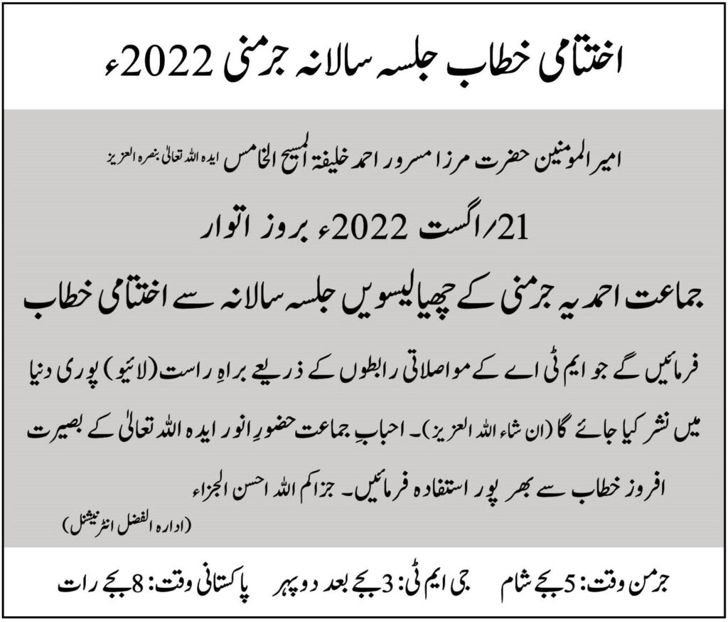امیر المومنین حضرت مرزا مسرور احمد خلیفۃ المسیح الخامس ایدہ اللہ تعالیٰ بنصرہ العزیز21؍اگست 2022ء بروز اتوارجماعت احمدیہ جرمنی کے چھیالیسویں جلسہ سالانہ سے اختتامی خطاب فرمائیں گے جو ایم ٹی اے کے مواصلاتی رابطوں کے ذریعے براہِ راست(لائیو) پوری دنیا میں نشر کیا جائے گا (ان شاء اللہ العزیز)۔ احبابِ جماعت حضورِانور ایدہ اللہ تعالیٰ کے بصیرت افروز خطاب سے بھر پور استفادہ فرمائیں۔ جزاکم اللہ احسن الجزاء جرمن وقت: 5بجے شام جی ایم ٹی: 3بجے بعد دوپہر پاکستانی وقت: 8بجے رات (ادارہ الفضل انٹرنیشنل)