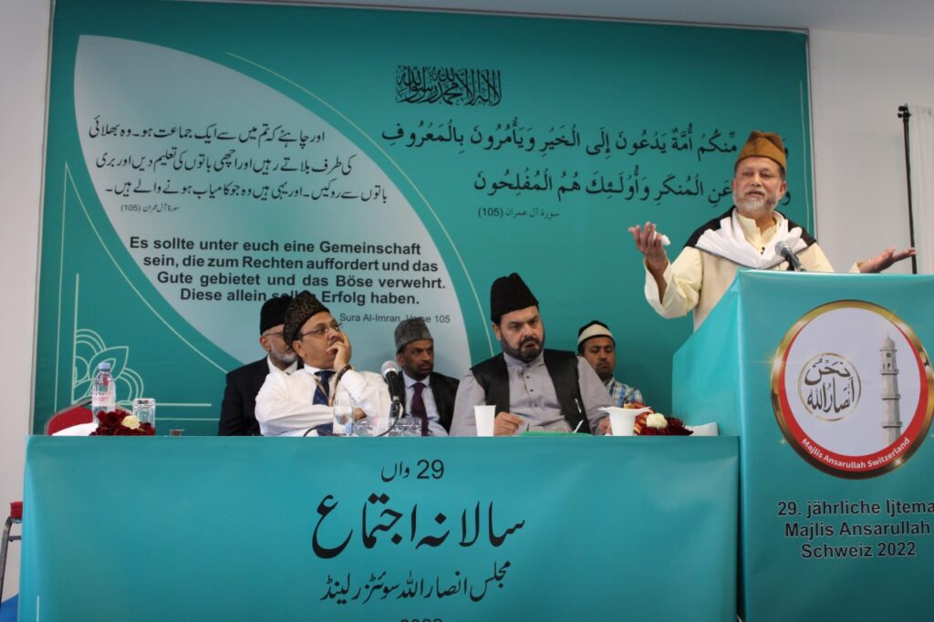 مجلس انصار اللہ سوئٹزرلینڈ کا 29واں سالانہ اجتماع مورخہ 20و21؍اگست 2022ء کو مسجد نور ویگولٹینگن کے ملحقہ ہال میں منعقد ہوا۔ پہلے دن اجتماع کا آغاز پرچم کشائی کی تقریب سے ہوا جو مرکزی نمائندہ محترم عبدالخالق صاحب ایڈیشنل پرائیویٹ سیکرٹری برائے انصار اللہ اور مکرم ملک عارف محمود صاحب صدر مجلس انصار اللہ سوئٹزرلینڈ نے کی۔ اس کے بعد محترم منیر احمد منور صاحب مبلغ انچارج سوئٹزرلینڈ نے دعا کروائی۔ پرچم کشائی کے بعد پہلے اجلاس کی کارروائی کاآغاز محترم صدر صاحب مجلس انصار اللہ سوئٹزرلینڈ کی صدارت میں مکرم رفیق الدریس صاحب کی تلاوت قرآن کریم سے ہوا۔ جس کاجرمن ترجمہ مکرم بشارت احمد انیس صاحب جبکہ اردو ترجمہ مکرم بشیر احمد طاہر صاحب نے پیش کیا۔ تلاوت قرآن کریم کے بعد صدر صاحب مجلس انصار اللہ سوئٹزرلینڈ نے انصار اللہ کا عہد دہرایا۔ عہد کے بعد مکرم مسعود مجاہد صاحب نے حضرت مسیح موعود علیہ السلام کا منظوم کلام خوش الحانی سےپڑھا۔ اس کے بعد محترم مبلغ انچارج صاحب سوئٹزرلینڈ نے افتتاحی خطاب کیا جس میں انہوں نے قرآن کریم اور اقتباسات حضرت اقدس مسیح موعود علیہ السلام سے انصار اللہ کو ان کی ذمہ دار یوں سے آگاہ کیا۔ افتتاحی خطاب کےبعد صدر صاحب مجلس انصار اللہ نے خطاب کیا جس میں انہوں نے حضور انور ایدہ اللہ تعالیٰ کی طرف سے مجلس انصار اللہ سوئٹزرلینڈ کو براہ راست دی گئی ذمہ داریاں یاد کرواتےہوئے ان سے دعاؤں اور حکمت سے عہدہ برا ہونے کی تلقین کی۔ صدر صاحب مجلس انصار اللہ کے خطاب کے بعد محترم مبلغ انچارج صاحب نے دعا کروائی۔ دعا کے بعد مکرم نعیم اللہ صاحب قائدتعلیم کی زیر نگرانی علمی مقابلہ جات کروائے گئے۔ منصفین کے فرائض مربیان سلسلہ مکرم عبدالوہاب طیب صاحب، مکرم فائز احمد خان صاحب اور مکرم فہیم احمد خان صاحب نے ادا کیے۔ دوپہر کے وقفہ تک علمی مقابلہ جات کا سلسلہ جاری رہا۔ نماز ظہر وعصر کے بعدتین بجے سے شام چھ بجے تک موحل ہائم کے سیکنڈری سکول کے ہال اور میدان میں ورزشی مقابلہ جات ہوئے۔ شام ساڑھے چھ تا سات بجے تک اجتماع کے ہال میں بیت بازی کامقابلہ ہوا۔ اجتماع کے دوسرے روز کا آغاز نماز تہجد، فجر اور قرآن کریم کے درس سے ہوا۔ ناشتہ کےبعد ساڑھے نو سے پونے گیارہ بجے تک ورزشی مقابلہ جات ہوئے۔ ساڑھے گیارہ بجے دوسرے اجلاس کی کارروائی کاآغاز محترم صدر صاحب مجلس انصار اللہ سوئٹزرلینڈ کی صدارت میں مکرم میاں ناصر صاحب کی تلاوت قرآن کریم سے ہوا۔ بعد ازاں علمی مقابلہ جات منعقد ہوئے جن کا سلسلہ سوا بارہ بجے تک دوسرے اجلاس کی کارروائی کے اختتام تک جاری رہا۔ دوسرے اجلاس کی کارروائی کے اختتام کے معاً بعد مرکزی مہمان خصوصی محترم عبدالخالق صاحب کے ساتھ اجتماع کی انتظامیہ کےگروپ فوٹوز ہوئے۔ فوٹو سیشن کے بعد اسی جگہ بارہ بیس سے ایک بجے تک مجلس انصار اللہ کی نیشنل عاملہ و زعماء کرام کا خصوصی اجلاس ہوا۔ جس میں مرکزی مہمان خصوصی صاحب نے جائزہ لیا اور مناسب ہدایات سے نوازا۔ دوپہر کے کھانے اور نماز ظہر وعصر کے بعد سوا دو سے دو بج کرپچاس منٹ تک جماعت کے شعبے وصایا کے زیر اہتمام محترم مبلغ انچارج صاحب کی صدارت میں وصیت سیمینار منعقد کیا گیا۔ اجتماع کے تیسرے اور آخری اجلاس کی کارروائی کاآغاز مرکزی مہمان خصوصی صاحب کی صدارت میں مکرم بشارت احمد انیس صاحب کی تلاوت قرآن کریم مع اردو و جرمن ترجمہ سے ہوا۔ صدر صاحب مجلس انصار اللہ نے انصار اللہ کا عہددہرایا، جس کاجرمن ترجمہ مکرم بشارت احمد انیس صاحب نے کیا۔ عہد کے بعد مکرم رانا سکندراحمد صاحب نے حضرت اقدس مسیح موعود علیہ السلام کا منظوم کلام نہایت خوش الحانی سے پڑھا۔ منظوم کلام کےبعد مکرم اویس احمد طاہر صاحب نے اجتماع کی رپورٹ پیش کی۔ رپورٹ کے بعد علمی اور ورزشی مقابلہ جات میں نمایاں کامیابی حاصل کرنے والوں میں مرکزی مہمان خصوصی صاحب نے انعامات تقسیم کیے۔ تقسیم انعامات کےبعد مرکزی مہمان خصوصی صاحب نے اختتامی خطاب شروع کیا۔ جس میں انہوں نے حضور انور کی ہدایات اور پرنور ایمان افروز واقعا