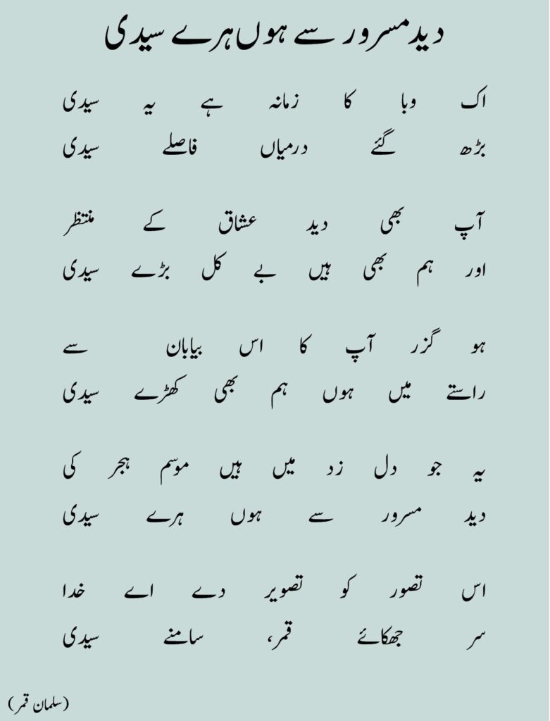 اک وبا کا زمانہ ہے یہ سیدی بڑھ گئے درمیاں فاصلے سیدی آپ بھی دید عشاق کے منتظر اور ہم بھی ہیں بے کل بڑے سیدی ہو گزر آپ کا اس بیابان سے راستے میں ہوں ہم بھی کھڑے سیدی یہ جو دل زد میں ہیں موسم ہجر کی دید مسرور سے ہوں ہرے سیدی اس تصور کو تصویر دے اے خدا سر جھکائے قمر، سامنے سیدی
