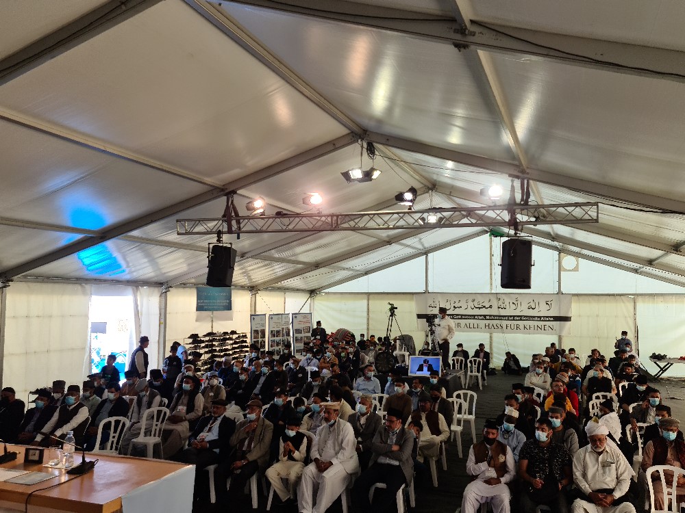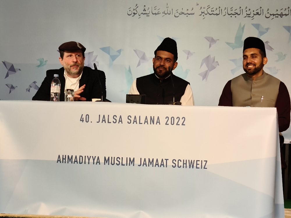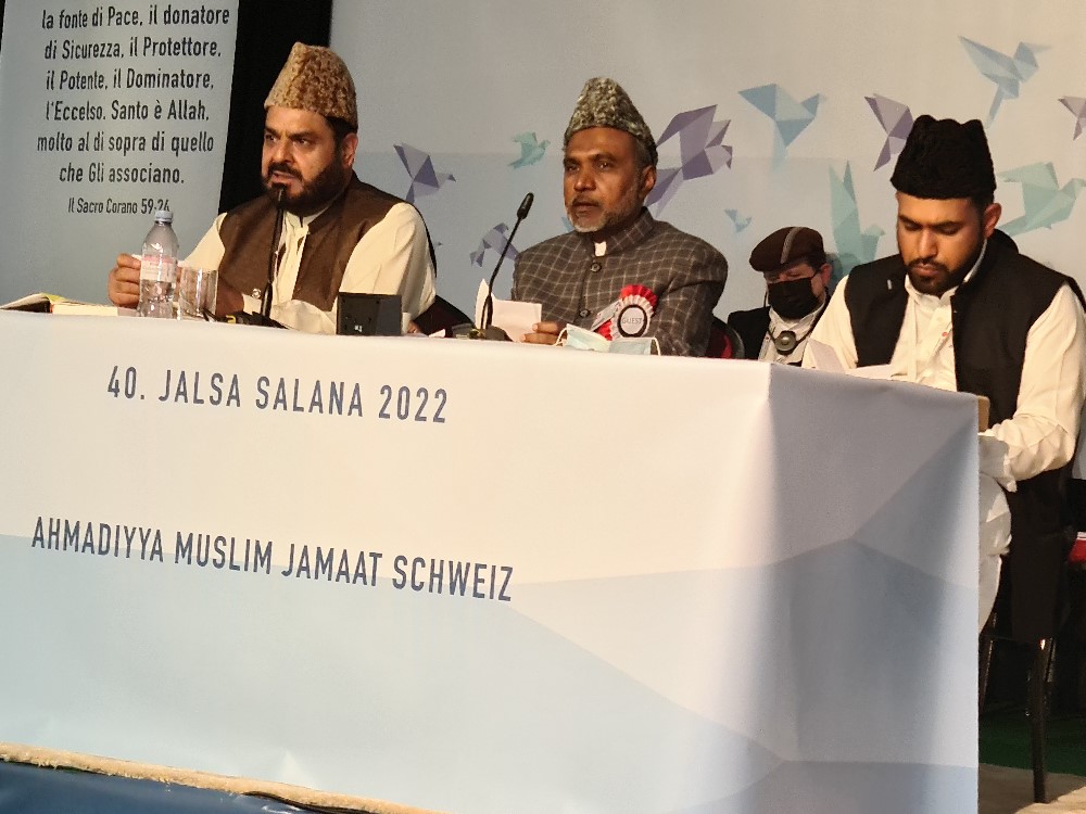 ٭…حضرت خلیفۃ المسیح الخامس ایّدہ اللہ کا خصوصی پیغام، نمازِ تہجد سے دن کا آغاز، دورانِ جلسہ علمی اور تربیتی عناوین پر پُرمغز تقاریر، تصویری نمائش اورملکی اخبارات میں جلسہ کی کوریج محض اللہ تعالیٰ کے فضل سے سلسلہ عالیہ احمدیہ کی روایات کے مطابق جماعت احمدیہ سوئٹزرلینڈ کا 40واں جلسہ سالانہ مورخہ 9 تا11 ستمبر 2022ء نور مسجد ویگولٹینگن کے احاطہ میں منعقد ہوا۔ جلسہ کی تیاری کے سلسلے میں مکرم ملک عارف محمود صاحب افسر جلسہ سالانہ اور مکرم زاہد اسماعیل بٹ صاحب افسر خدمتِ خلق کی قیادت میں خدام، انصار اور لجنہ اماء اللہ نے خدمتِ دین کے جوش و جذبہ اور اخلاص کا مظاہرہ کرتے ہوئے بہت محنت سے متعدد وقارِ عمل کیے۔ اس تمام تیاری کی نگرانی افسر رابطہ مکرم ولید طارق تارنتسر صاحب امیر جماعت احمدیہ سوئٹزرلینڈ نے کی۔ جلسہ کے لیے نصب کی گئی عارضی مارکی میں مردوں کا انتظام کیا گیا جبکہ ملحقہ نور ہال میں لجنہ اماء اللہ کے لیے جلسہ کا اہتمام کیا گیا۔ کووڈ 19کی وبا کی وجہ سے گذشتہ سالوں میں جلسہ میں ایک محدود تعداد میں احباب کو شامل ہونے کی اجازت تھی۔ اللہ تعالیٰ کے فضل سے اس سال جلسہ میں سب کو شامل ہونے کی اجازت تھی جس کی وجہ سے اس سال شاملینِ جلسہ کی تعداد 809تھی۔ شعبہ رجسٹریشن کی رپورٹ کے مطابق جلسہ میں305 مرد اور 342خواتین شامل ہوئے۔ اسی طرح پاکستان، جرمنی، آسٹریا اور ماریشیئس سے ایک سو احمدی مہمان بھی شامل ہوئے۔ نیز 8سوِس زیرِ تبلیغ افراد اور 54ترک نسل کے یوکرینی غیر احمدی مسلمان شامل ہوئے۔ اللہ تعالیٰ کے فضل سے جلسہ سالانہ کے دوران ہفتہ اور اتوار کے روز نور مسجد میں باجماعت نمازِ تہجد ادا کی گئی جو مکرم حافظ طاہر ادریس صاحب آف نائیجیریا حال جینیوانے پڑھائی۔ نمازِ فجر اور اس کے بعد درسِ قرآنِ کریم مکرم محمد فائز احمد خان صاحب نے تفسیرِ کبیر سے دیا جس کا جرمن اور انگریزی ترجمہ بھی پیش کیا جاتا رہا۔ جلسہ کا پہلا روز مورخہ 09؍ستمبر 2022ء بروز جمعہ سہ پہر چار بج کر 25 منٹ پر پرچم کشائی ہوئی۔ محترم منیر احمد منور صاحب مبلغ انچارج سوئٹزرلینڈ نے لوائے احمدیت لہرایا جب کہ محترم ولید طارق تارنتسر صاحب نیشنل امیر جماعت ہائے احمدیہ سوئٹزرلینڈنے ملک کا جھنڈا لہرایا اور دعاکروائی۔ ساڑھے چار بجے جلسہ کی باقاعدہ کارروائی کا آغاز ہوا۔ افتتاحی اجلاس محترم مبلغ انچارج صاحب کی صدارت میں ہوا۔ مکرم مسعود مجاہدصاحب نے تلاوت قرآن کریم و اردو ترجمہ پیش کیا۔ جبکہ جرمن ترجمہ مکرم طارق ریاض گورائیہ صاحب نیشنل سیکرٹری تعلیم نے پیش کیا۔ تلاوت قرآن کریم کے بعد مکرم شیراز شریف صاحب نے حضرت اقدس مسیح موعود علیہ السلام کا پاکیزہ منظوم کلام خوش الحانی سےپڑھا۔ منظوم کلام کےبعد حضور انور ایدہ اللہ تعالیٰ بنصرہ العزیز کا جلسہ سالانہ سوئٹزرلینڈ کے لیے انگریزی زبان میں آیا خصوصی پیغام مکرم عبدالوہاب طیّب صاحب مربی سلسلہ نے پیش کیا۔ جس کا اردو ترجمہ محتر م مبلغ انچارج صاحب اور جرمن ترجمہ محترم امیر صاحب نے پیش کیا۔حضور انور ایدہ اللہ تعالیٰ کے پیغام کے بعد محترم مبلغ انچارج صاحب نے افتتاحی خطاب کیا اور دعا کروائی۔ افتتاحی خطاب و دعا کےبعد مکرم محمد بشیر صاحب نیشنل سیکرٹری وصایا نے ’’تعلق باللہ کے متعلق حضرت اقدس مسیح موعود علیہ السلام کی تعلیم‘‘ کے موضوع پر اردو میں تقریر کی۔ (یاد رہے کہ یہ تقریر ڈاکٹر شمیم احمد قاضی صاحب نے کرنی تھی جو بیماری کی وجہ سے جلسہ پر تشریف نہ لا سکے تھے۔) اس تقریر کے بعد مکرم ماہد مجاہد صاحب نے حضرت مسیح موعود علیہ السلام کا پاکیزہ منظوم کلام خوش الحانی سے پڑھا۔ اس منظوم کلام کےبعد مکرم اویس احمد طاہر صاحب نیشنل سیکرٹری تبلیغ نے ’’تبلیغ دین ایک اہم فریضہ‘‘ کے موضوع پر جرمن زبان میں تقریر کی۔ تقریر کے بعد ضروری اعلانات ہوئے اور شام سوا چھ بجے جلسہ کے پہلے روز کی کارروائی اپنے اختتام کو پہنچی۔ جلسہ کا دوسرا روز جلسہ کے دوسرے روز دوسرے اجلاس کی کارروائی کا آغاز محترم عبدالوہاب طیّب صاحب مربی سلسلہ کی صدارت میں مکرم ق