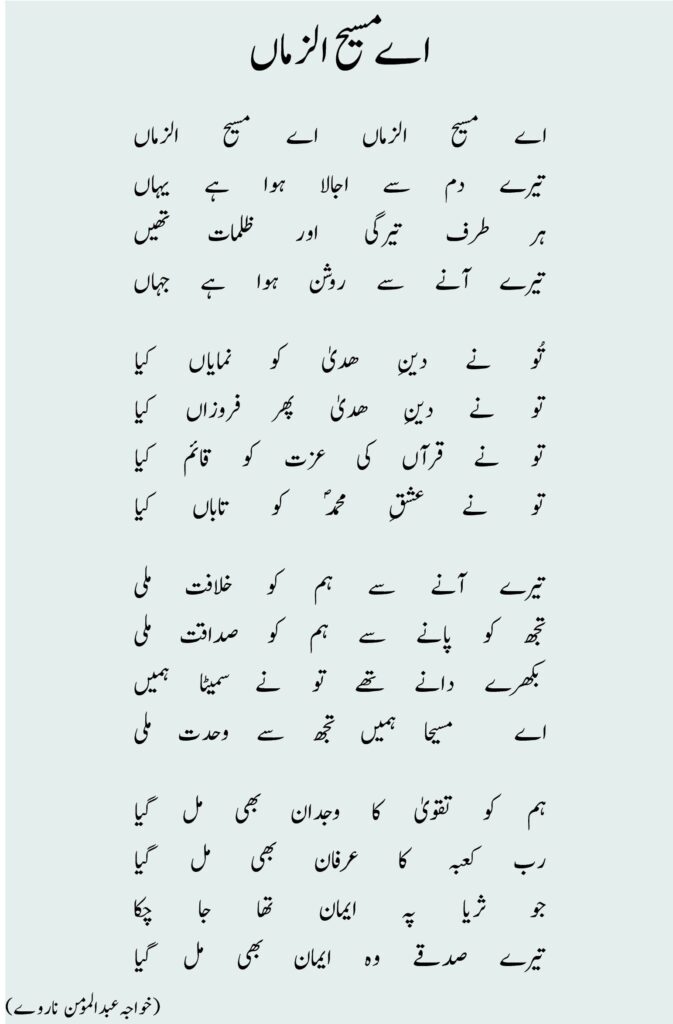 اے مسیح الزماں اے مسیح الزماںتیرے دم سے اجالا ہوا ہے یہاںہر طرف تیرگی اور ظلمات تھیںتیرے آنے سے روشن ہوا ہے جہاں تُو نے دینِ ھدیٰ کو نمایاں کیاتو نے دینِ ھدیٰ پھر فروزاں کیاتو نے قرآں کی عزت کو قائم کیاتو نے عشقِ محمدؐ کو تاباں کیا تیرے آنے سے ہم کو خلافت ملیتجھ کو پانے سے ہم کو صداقت ملیبکھرے دانے تھے تو نے سمیٹا ہمیںاے مسیحا ہمیں تجھ سے وحدت ملی ہم کو تقویٰ کا وجدان بھی مل گیارب کعبہ کا عرفان بھی مل گیاجو ثریا پہ ایمان تھا جا چکاتیرے صدقے وہ ایمان بھی مل گیا (خواجہ عبدالمومن ناروے)