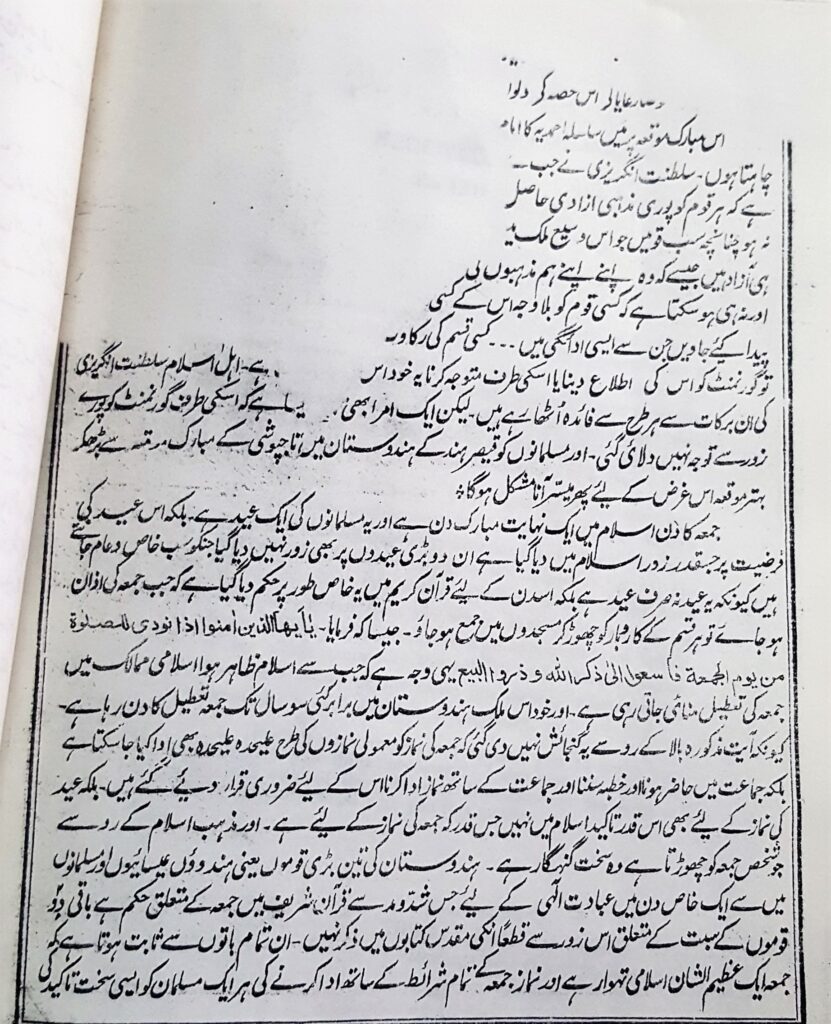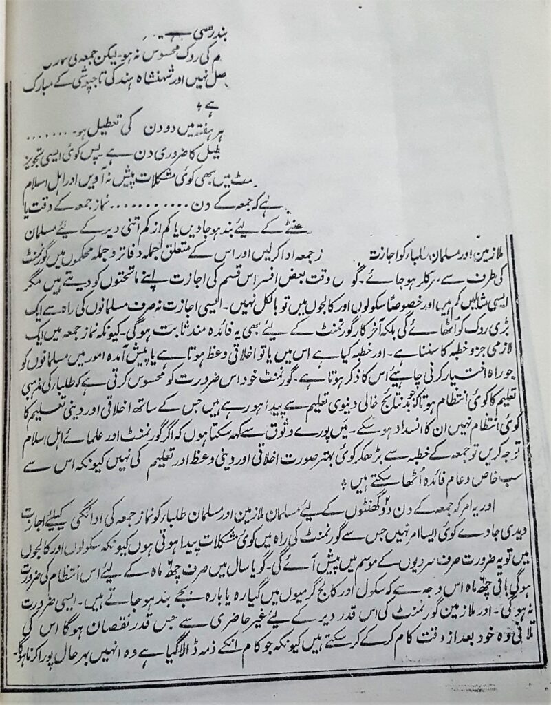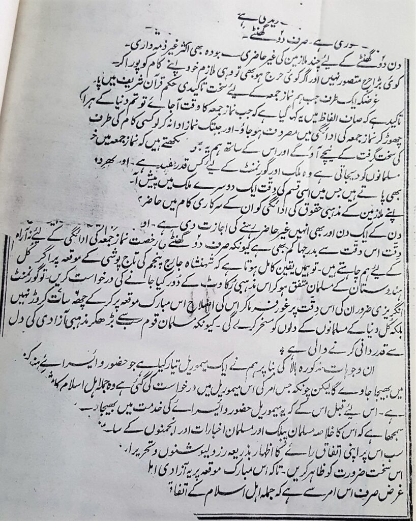 Listen to 20221013-Taareekhi Dastawezat Memorial Rukhsat Jumaa 2 byAl Fazl International on hearthis.at (حضرت خلیفة المسیح الاوّل رضی اللہ عنہ بنام وائسرائے ہند برموقع تقریب تاجپوشی شہنشاہ جارج پنجم) ’’کیا کوئی ایسا شخص بھی ہے جس کے دل میں حضرت محمد مصطفیٰﷺ اور آپؐ کے پیارے دین اسلام کی سچی محبت ہواور وہ اس میموریل کی مخالفت کرے یا اسے ناپسند کرے‘‘ شہنشاہ جارج پنجم کی تاجپوشی اور دربار دہلی کا انعقاد 13؍دسمبر 1911ء کو حکومت ہند نے تاج پوشی شہنشاہ جارج پنجم کی تاریخ کا اعلان کردیا تھا۔ اس تاریخی موقع پر مختلف تنظیموں اور گروہوں نے بادشاہِ وقت کے حضور اپنی مناجات اور مراعات کے حصول کے لیے درخواستیں بھجوانا شروع کیں۔ حضرت خلیفة المسیح الاولؓ نے بھی دہلی میں ہونے والی شہنشاہ جارج پنجم کی تاجپوشی کی تقریب(دربار دہلی) کو بہترین اورمبارک موقع گردانتے ہوئے تقریبا ً6 ماہ پیشتر جولائی کے مہینہ میں جمعہ کی چھٹی بحال کرنے کے لیے مسلمانوں کو مخاطب کرتے ہوئے ایک تفصیلی مکتوب لکھا۔یہ خط حضور نے یکم جولائی 1911ء کو تحریر فرمایا جو 3؍جولائی کو میگزین پریس قادیان سے طبع ہوکر آیا اور پھر ہندوستان بھر میں بھجوایا گیا۔ مسلم لیگ کے ریکارڈ سے اس اصل خط کے بعض تراشے میسر آسکے جو قارئین کے استفادہ کے لیے دیے جارہے ہیں۔ (یہ خط اخبار بدر (قادیان) میں 20؍جولائی 1911ء میں مکمل موجود ہے۔)آپؓ فرماتے ہیں: ’’پس یہ لازمی امر ہے کہ ایسے عظیم الشان اور مبارک موقعہ پر طرح طرح کی امنگیں طبائع میں پیدا ہوتیں اور خصوصاً رعایا کے اس حصہ کے دلوں میں جواپنے بادشاہ کی وفاداری کواپنے مذہب کا ایک جزو سمجھتے ہیں۔‘‘ چنانچہ تمام مسلمانوں کو اس اہم ترین مسئلہ کی بابت توجہ دلاتے ہوئے اور بحیثیت امام جماعت احمدیہ آپ نے فرمایا کہ ’’اس مبارک موقعہ پر میں سلسلہ احمدیہ کا امام ہونے کی حیثیت سے ایک اہم امر کی طرف تمام مسلمانان ہند کو متوجہ کرنا چاہتا ہوں۔‘‘ نماز جمعہ کی اہمیت وفرضیت حضور انور نے قدرے تفصیل کے ساتھ نماز جمعہ کی اہمیت اور فرضیت پر روشنی ڈالی۔ پھر آپؓ نے گورنمنٹ کی مذہبی آزادی کی پالیسی کی تعریف کی کہ کس طرح حکومت اپنی رعایا کے ہر طبقے کا خیال رکھ رہی ہے اور کوشش میں ہے کہ ہر ایک کو مذہبی آزادی حاصل ہو۔چنانچہ آپ اسی مکتوب میں فرماتے ہیں کہ ’’ ہماری مہربان گورنمنٹ نے صرف مذہبی آزادی کو مدنظر رکھ کر یہ ضروری قرار دیا ہے کہ سب قوموں کے بڑے بڑے تہواروں کےدنوں میں تمام سرکاری دفاتر اور سب عدالتیں وغیرہ بند رہیں تاکہ وہ حصہ رعایا جو ملازم گورنمنٹ ہیں اپنے دوسرے بھائیوں کےساتھ ان تہواروں کے منانےمیں شریک ہوسکیں‘‘۔اسی تسلسل میں آپؓ نے نماز جمعہ کی اہمیت اور اجتماعیت کے پیش نظر جمعہ کی رخصت کی بابت زور دینے کی تحریک کی اور فرمایا کہ ’’یہ امر تو ظاہرہوگیا کہ گورنمنٹ کادلی منشا یہ ہے کہ کسی قوم کو اپنے مذہبی فرائض کی ادائیگی میں کسی قسم کی روک محسوس نہ ہو لیکن جمعہ کی نماز کی ادائیگی کے لیے جہاں تک دیکھاگیا ہے اس قسم کی آزادی ابھی تک حاصل نہیں اور شہنشاہ ہند کی تاجپوشی کے مبارک موقعہ پر اس آزادی کے حصول کے لیے جس قدر زور دیا جائے کم ہے۔‘‘ حضور ؓکی تجویز اس مقصد کے لیے آپ ؓ نے اس حقیقت کو جانتے ہوئے کہ پہلے سے رائج اتوار کی رخصت کی موجودگی میں ہفتہ میں مزید ایک اور رخصت دینا حکومت کے لیے ممکن نہ ہوگا یہ تجویز پیش کی کہ ’’جمعہ کےدن نماز جمعہ کے وقت یاتوسب دفاتر اور عدالتیں سکول کالج وغیرہ 2گھنٹے کے لیے بند ہوجاویں یا کم ازکم اتنی دیر کے لیے مسلمان ملازمین اور مسلمان طلباء کواجازت ہوکہ وہ نماز جمعہ اداکرلیں اس کے متعلق جملہ دفاترو جملہ محکموں میں گورنمنٹ کی طرف سے سرکلر ہوجائے ‘‘۔ حضرت خلیفہ اولؓ نے اپنی تجویز سے پیشتر اس بات کو یقینی بنایا کہ ایسی تجویز گورنمنٹ کےسامنے پیش کرنی چاہیے جس سے نظام گورنمنٹ میں بھی کوئی مشکلات پیش نہ آویں۔اور مطلوبہ رخصت کے عنایت ہونے میں بھی مشکل نہ آئے۔ مصر کی مثال حضورؓ نے مسلمانوں کو جمعہ کےروز اس مختصر رخصت دیے جانے کی دلیل اور نمونہ کے طور پرملک مص