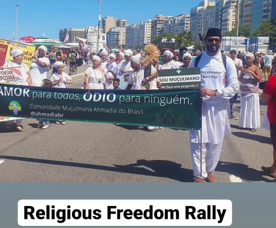 برازیل کے شہر Rio de Janeiro میں مورخہ 18؍ستمبر 2022ء کو مذہبی رواداری اور مذہبی آزادی کے حق میں پُر امن ریلی کا انعقاد کیا گیا۔ جس میں مختلف مذاہب سے لگ بھگ 50 ہزار افراد نے شرکت کی۔ اس ریلی کا مقصد برازیل میں مختلف مذاہب میں ہم آہنگی پیدا کرناہے۔ ریلی کی انتظامیہ نے جماعت احمدیہ کو بھی شمولیت کی دعوت دی۔ چنانچہ اسلام کی نمائندگی کرتے ہوئے خاکسار نے اس ریلی میں شرکت کی۔ جماعت احمدیہ واحد جماعت تھی جو اسلام کی نمائندگی میں اس ریلی میں شامل ہوئی۔ اس ریلی میں ایک بڑا ٹرک تھا جس پر بڑے سپیکر لگا کر سب مذہبی لیڈروں کو باری باری اپنے مذاہب کی تعلیمات بیان کرنے نیز اظہار خیال کرنے کا موقع دیا گیا۔ لہذا خاکسار کو بھی اس جگہ 10منٹ عوام سے گزارشات کرنے کا موقع ملا۔ خاکسار نے ابتداء میں سورۃ الفاتحہ کی تلاوت کی اور اس کا ترجمہ پرتگیزی زبان میں پڑھا اور اس کے بعد خاکسار نے اسلام کی پُر امن تعلیمات کا خلاصہ بیان کیا اور بتایا کہ اسلام امن، محبت اور رواداری کی تعلیم دیتا ہے۔ نیز اسلام نے حقوق اللہ کے ساتھ ساتھ حقوق العباد بھی قائم فرمائے ہیں۔ اور اگر کوئی شخص مسلمان ہو کر اسلام کی تعلیمات پر عمل نہیں کرتا تو اس کا ذمہ وار ہم ہر گز اسلام کو نہیں ٹھہرا سکتے۔ بلکہ یہ اس کا اپنا ذاتی فعل ہے جس کا مذہب کے ساتھ کوئی تعلق نہیں۔ خاکسار کی گزارشات سے قبل آس پاس مختلف میوزک وغیرہ چل رہے تھے۔ جیسے ہی خاکسار نے قرآن کریم کی تلاوت لاؤڈ سپیکر میں شروع کی تو ہر طرف سناٹا چھا گیا اور اکثر لوگوں کے لیے یہ پہلا موقع تھا کہ وہ تلاوت قرآن سنیں۔ تقریر سے قبل وہاں پر موجود بعض لوگ آپس میں باتوں میں مشغول تھے۔ مگر تقریر شروع ہوتے ہی انہوں نے بھی بڑی انہماک سے تلاوت سنی۔ خاکسار کی تقریر کے بعد مختلف لوگوں اور مذہبی لیڈروں نے اس بات کا اظہار کیا کہ بہت خوبصورت تعلیمات بیان کی گئی ہیں اور ہم ان سے بالکل نا واقف تھے۔ اس ریلی کو میڈیا نے بھی کافی کوریج دی۔ برازیل کے سب سے بڑے اخبار Globo نے بھی ہماری تصویر کے ساتھ اپنے اخبار میں اس خبر کو شائع کیا۔ نیز برازیل کے سب سے بڑے TV چینل پر بھی اس خبر کو شائع کرتے ہوئے ہماری تصویر اور ماٹو محبت سب کے لیے، نفرت کسی سے نہیں کو دکھایا گیا۔ اللہ تعالیٰ سے دعا ہے کہ وہ ہماری ادنیٰ مساعی کو قبول فرمائے اور لوگوں تک اسلام کی حقیقی تعلیم پہنچانے کی توفیق ملے۔نیز اللہ کرے کہ اس پروگرام کے مثبت نتائج ظاہر ہوں۔ آمین