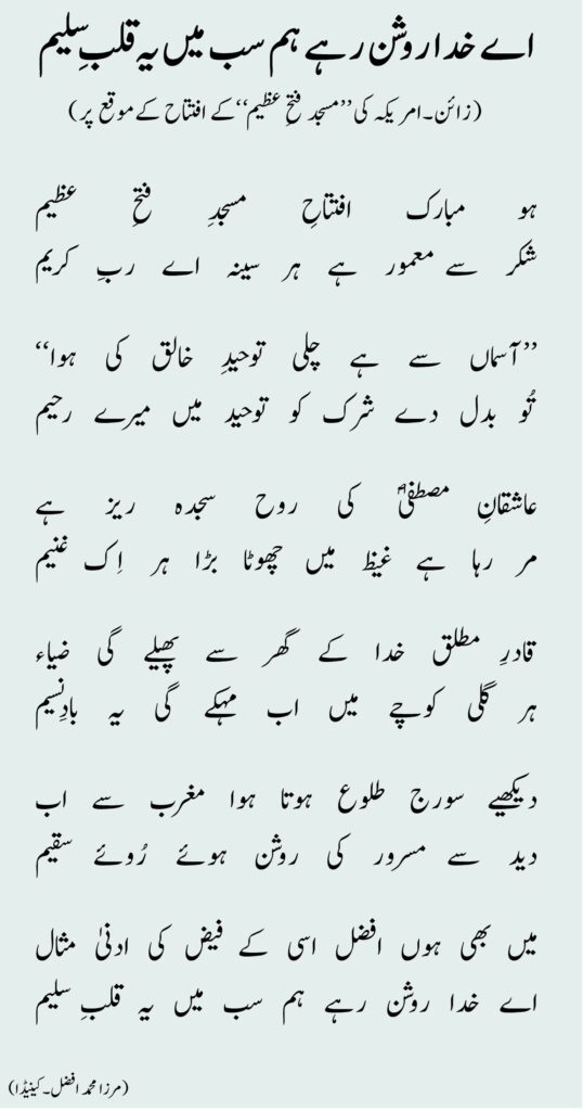 ہو مبارک افتتاحِ مسجدِ فتحِ عظیمشکر سے معمور ہے ہر سینہ اے ربِ کریم ’’آسماں سے ہے چلی توحیدِ خالق کی ہوا‘‘تُو بدل دے شرک کو توحید میں میرے رحیم عاشقانِ مصطفیٰؐ کی روح سجدہ ریز ہےمر رہا ہے غیظ میں چھوٹا بڑا ہر اِک غنیم قادرِ مطلق خدا کے گھر سے پھیلے گی ضیاءہر گلی کوچے میں اب مہکے گی یہ بادِنسیم دیکھیے سورج طلوع ہوتا ہوا مغرب سے ابدید سے مسرور کی روشن ہوئے رُوئے سقیم میں بھی ہوں افضل اسی کے فیض کی ادنیٰ مثالاے خدا روشن رہے ہم سب میں یہ قلبِ سلیم