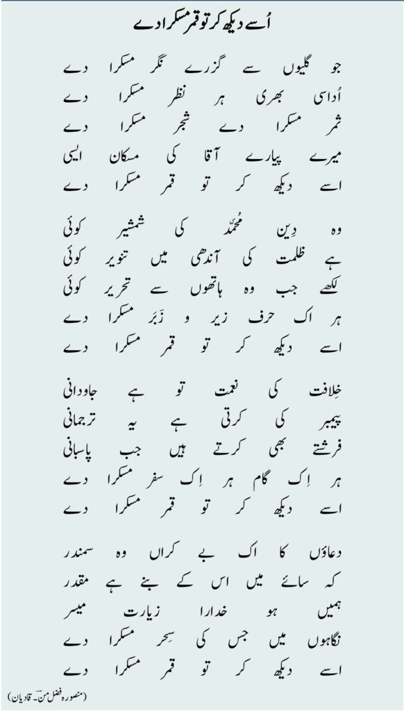 جو گلیوں سے گزرے نگر مسکرا دےاُداسی بھری ہر نظر مسکرا دےثمر مسکرا دے شجر مسکرا دےمیرے پیارے آقا کی مسکان ایسیاسے دیکھ کر تو قمر مسکرا دے وہ دِین مُحَمّد کی شمشیر کوئیہے ظلمت کی آندھی میں تنویر کوئیلکھے جب وہ ہاتھوں سے تحریر کوئیہر اک حرف زیر و زَبَر مسکرا دےاسے دیکھ کر تو قمر مسکرا دے خِلافت کی نعمت تو ہے جاودانیپیمبر کی کرتی ہے یہ ترجمانیفرشتے بھی کرتے ہیں جب پاسبانیہر اِک گام ہر اِک سفر مسکرا دےاسے دیکھ کر تو قمر مسکرا دے دعاؤں کا اک بے کراں وہ سمندرکہ سائے میں اس کے بنے ہے مقدرہمیں ہو خدارا زیارت میسرنگاہوں میں جس کی سِحر مسکرا دےاسے دیکھ کر تو قمر مسکرا دے