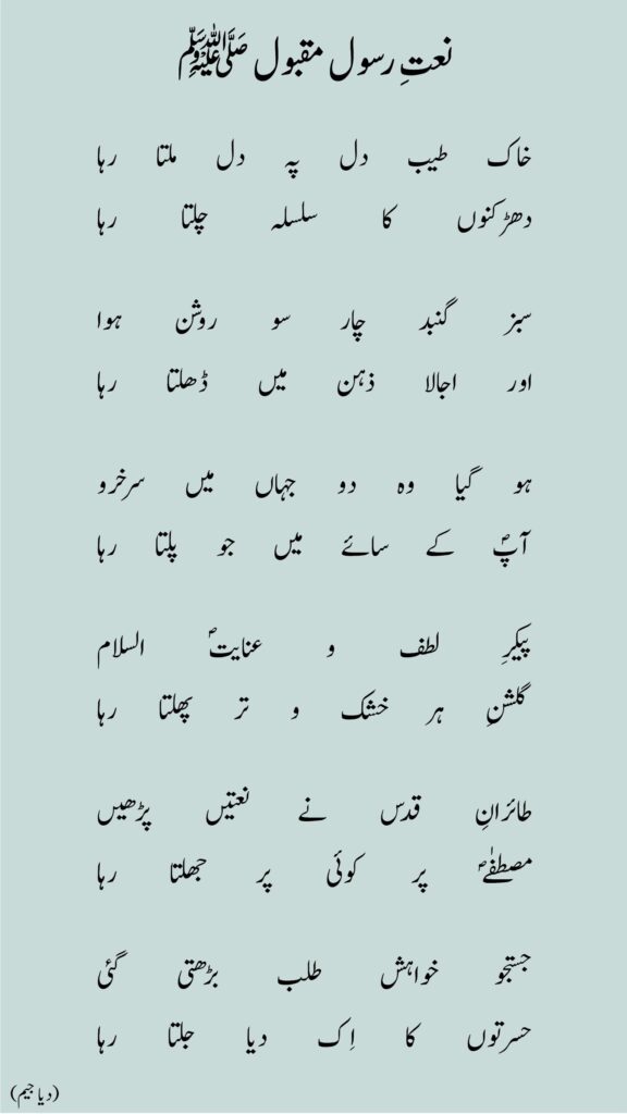 خاک طیب دل پہ دل ملتا رہادھڑکنوں کا سلسلہ چلتا رہا سبز گنبد چار سو روشن ہوااور اجالا ذہن میں ڈھلتا رہا ہو گیا وہ دو جہاں میں سرخروآپؐ کے سائے میں جو پلتا رہا پیکرِ لطف و عنایتؐ السلامگلشنِ ہر خشک و تر پھلتا رہا طائرانِ قدس نے نعتیں پڑھیںمصطفٰےؐ پر کوئی پر جھلتا رہا جستجو خواہش طلب بڑھتی گئیحسرتوں کا اِک دیا جلتا رہا
