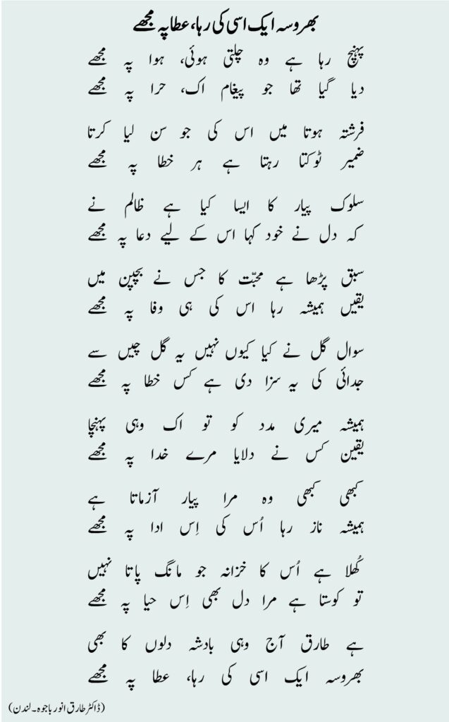بھروسہ ایک اسی کی رہا، عطا پہ مجھے پہنچ رہا ہے وہ چلتی ہوئی، ہوا پہ مجھے دیا گیا تھا جو پیغام اک، حرا پہ مجھے فرشتہ ہوتا میں اس کی جو سن لیا کرتا ضمیر ٹوکتا رہتا ہے ہر خطا پہ مجھے سلوک پیار کا ایسا کیا ہے ظالم نے کہ دل نے خود کہا اس کے لیے دعا پہ مجھے سبق پڑھا ہے محبّت کا جس نے بچپن میں یقیں ہمیشہ رہا اس کی ہی وفا پہ مجھے سوال گل نے کیا کیوں نہیں یہ گل چیں سے جدائی کی یہ سزا دی ہے کس خطا پہ مجھے ہمیشہ میری مدد کو تو اک وہی پہنچا یقین کس نے دلایا مرے خدا پہ مجھے کبھی کبھی وہ مرا پیار آزماتا ہے ہمیشہ ناز رہا اُس کی اِس ادا پہ مجھے کُھلا ہے اُس کا خزانہ جو مانگ پاتا نہیں تو کوستا ہے مرا دل بھی اِس حیا پہ مجھے ہے طارق آج وہی بادشہ دلوں کا بھی بھروسہ ایک اسی کی رہا، عطا پہ مجھے (ڈاکٹر طارق انور باجوہ۔ لندن)