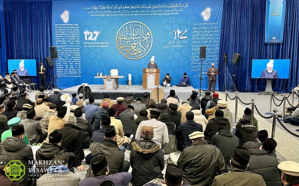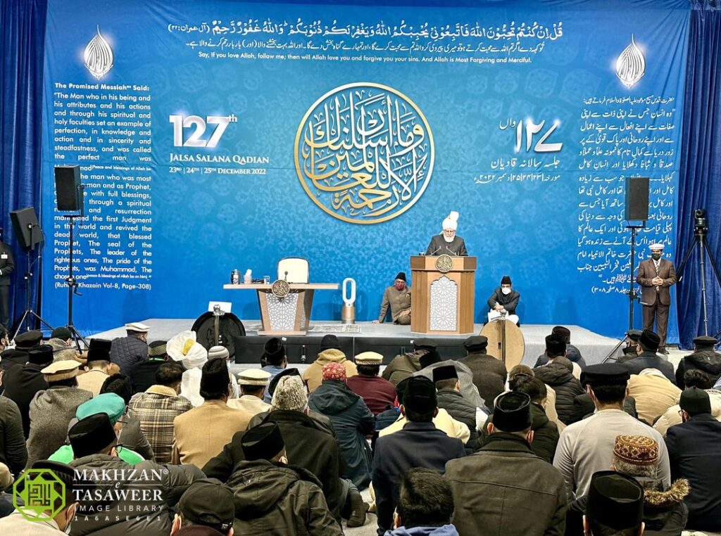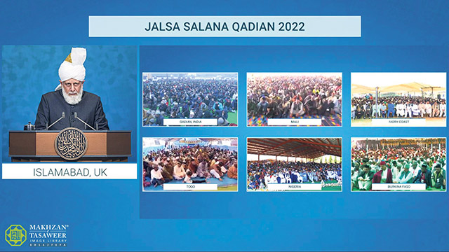 ٭…قادیان دار الامان کے ۱۲۷ویں جلسہ سالانہ کے اختتامی اجلاس سے بصیرت افروز خطاب ٭…آٹھ افریقی ممالک کے جلسہ ہائے سالانہ کے اجلاسات، نیز چھ ممالک سے براہ راست تصویری مناظر کی ٹیلی کاسٹ ٭… سلسلہ عالیہ احمدیہ میں داخل ہونے کی دوسری شرط بیعت کی ارشاداتِ ربّانی، احادیثِ مبارکہ اورحضرت اقدس مسیح موعود علیہ الصلوٰۃ و السلام کی نصائح کی روشنی میں پُر معارف تشریح (اسلام آباد، ٹلفورڈ، یوکے، ۲۵؍دسمبر ۲۰۲۲ء، نمائندگان الفضل انٹرنیشنل) جماعت احمدیہ مسلمہ بھارت کا ۱۲۷واں جلسہ سالانہ بانی جماعت احمدیہ حضرت اقدس مرزا غلام احمد قادیانی مسیح موعود و مہدی معہودعلیہ الصلوٰۃ والسلام کی مقدس بستی قادیان دارالامان میں ۲۳، ۲۴ و ۲۵؍دسمبر ۲۰۲۲ء کو اپنی تمام ترعظیم الشان روایات کے ساتھ بخیروخوبی منعقد ہوا جس میں۳۷ ممالک سےساڑھے چودہ ہزار کے قریب افراد نے شمولیت کی سعادت پائی۔ یاد رہے کہ سیدنا حضرت اقدس مسیح موعود علیہ الصلوٰۃ والسلام نے۱۸۹۱ء میں اذن الٰہی سےجلسہ سالانہ کی بنیاد قادیان دارالامان کی بستی میں رکھی جہاں مسجد اقصیٰ میں پہلا جلسہ منعقد ہوا۔ بعد ازاں ۱۹۴۸ء میں خلافتِ احمدیہ کے یہاں سے ہجرت کر جانے تک قادیان کے جلسہ ہائےسالانہ کو خلفائے کرام کی بنفس نفیس موجودگی کے باعث مرکزی حیثیت حاصل رہی۔ @JalsaQadian خلافت احمدیہ کی ولولہ انگیز قیادت میں جماعت احمدیہ روز بروز ترقیات کی منازل طے کرتی چلی جا رہی ہے۔ جماعت کو جمع کرنے کا ایک سنگِ میل تب طے ہوا جب فاصلوں کی دوریوں کے باوجود ایم ٹی اے کے توسط سے خلفائے کرام کا جلسہ سالانہ قادیان کے اختتامی اجلاس سے براہ راست مخاطب ہونے کا سلسلہ شروع ہوا۔ پھر خدا تعالیٰ کے افضال کے نتیجے میں وہ دَور آیا کہ باہمی رابطہ دو طرفہ ہونے کے باعث قادیان دارالامان کے براہِ راست مناظر بھی ٹیلی کاسٹ ہونے لگے۔ اور اب اللہ تعالیٰ نے ایک اور سنگ میل اس صورت میں جماعت کو عنایت فرمایا جس کا ذکر حضرت خلیفۃ المسیح الخامس ایدہ اللہ تعالیٰ بنصرہ العزیز نے اپنے خطبہ جمعہ فرمودہ ۲۳؍دسمبر۲۰۲۲ء میں فرمایا۔ چنانچہ جلسہ سالانہ قادیان کے علاوہ چھ افریقن ممالک نائیجیریا،آئیوری کوسٹ،گنی بساؤ،ٹوگو، برکینا فاسو اورمالی اس جلسے میں شامل تھے اور وہاں سے براہ راست تصویری مناظر بھی دکھائے گئے جبکہ زمبابوے اورگنی کناکری بھی جلسہ سالانہ قادیان کے اختتامی اجلاس میں شامل تھے۔ لا ریب یہ خلافت احمدیہ کی برکات کا ہی ثمرہ ہے اور امت مسلمہ کو امت واحدہ بنانے کی ایک کڑی ہے جسے ہم آج کے اختتامی اجلاس میں مشاہدہ کر رہے ہیں۔ امیرالمومنین حضرت خلیفۃالمسیح الخامس ایدہ اللہ تعالیٰ بنصرہ العزیز کی بابرکت صدارت میں ایوان مسرور، اسلام آباد سے ایم ٹی اے کے مواصلاتی رابطوں کے ذریعہ اس جلسہ کی اختتامی کارروائی تمام عالم میں براہ راست نشر ہوئی۔ @JalsaQadian اختتامی اجلاس کی کارروائی کے لیے حضورِ انور ایّدہ اللہ تعالیٰ بنصرہ العزیز دس بج کر اکتیس منٹ پر ایوان مسرور، اسلام آباد میں رونق افروز ہوئے۔حضور انور ایدہ اللہ تعالیٰ بنصرہ العزیز نے تمام شاملین کو ’السلام علیکم و رحمۃ اللہ‘ کا تحفہ پیش فرمایا۔ اجلاس کا باقاعدہ آغاز تلاوتِ قرآن کریم سے ہوا جس کی سعادت مولانا فیروز عالم صاحب کو ملی۔ آپ نے سورۃ البقرۃ آیات۲۸۵تا۲۸۷کی تلاوت اور تفسیر صغیر سے ان کا ترجمہ پیش کیا۔ بعد ازاں ناصر علی عثمان صاحب نے حضرت اقدس مسیح موعود علیہ السلام کا منظوم کلام بعنوان ’’مناجات اور تبلیغ حق‘‘ میں سے چند اشعار خوش الحانی سے پیش کیے جن کا آغاز اس شعر سے ہوا: اَے خدا اَے کارساز و عیب پوش و کردگار اَے مرے پیارے مرے محسن مرے پروردگار دس بج کر۵۱منٹ پر قادیان دار الامان سے بلند کیے جانے والے فلک شگاف نعروں کی گونج میں امیر المومنین حضرت خلیفۃ المسیح الخامس ایدہ اللہ تعالیٰ منبر پر رونق افروز ہوئے اور ’السلام علیکم ورحمۃ اللہ و برکاتہ‘کا تحفہ عنایت فرما کر اپنے خطاب کا آغاز فرمایا۔ خطاب حضورِ انور تشہد، تعوذ اور سورت فاتحہ کی تلاوت کے بعد ح
