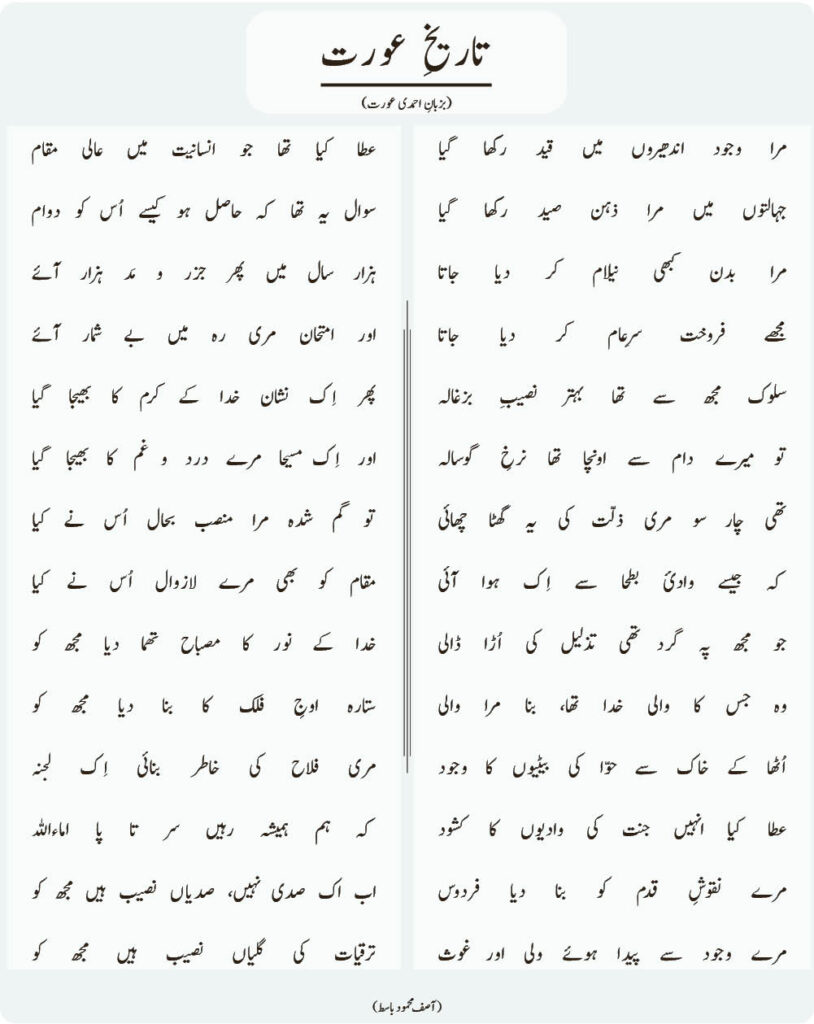 مرا وجود اندھیروں میں قید رکھا گیا جہالتوں میں مرا ذہن صید رکھا گیا مرا بدن کبھی نیلام کر دیا جاتا مجھے فروخت سرِعام کر دیا جاتا سلوک مجھ سے تھا بہتر نصیبِ بزغالہ تو میرے دام سے اونچا تھا نرخِ گوسالہ تھی چار سو مری ذلّت کی یہ گھٹا چھائی کہ جیسے وادیٔ بطحا سے اِک ہوا آئی جو مجھ پہ گرد تھی تذلیل کی اُڑا ڈالی وہ جس کا والی خدا تھا، بنا مرا والی اُٹھا کے خاک سے حوّا کی بیٹیوں کا وجود عطا کیا انہیں جنت کی وادیوں کا کشود مرے نقوشِ قدم کو بنا دیا فردوس مرے وجود سے پیدا ہوئے ولی اور غوث عطا کیا تھا جو انسانیت میں عالی مقام سوال یہ تھا کہ حاصل ہو کیسے اُس کو دوام ہزار سال میں پھر جزر و مَد ہزار آئے اور امتحان مری رہ میں بے شمار آئے پھر اِک نشان خدا کے کرم کا بھیجا گیا اور اِک مسیحا مرے درد و غم کا بھیجا گیا تو گم شدہ مرا منصب بحال اُس نے کیا مقام کو بھی مرے لازوال اُس نے کیا خدا کے نور کا مصباح تھما دیا مجھ کو ستارہ اوجِ فلک کا بنا دیا مجھ کو مری فلاح کی خاطر بنائی اِک لجنہ کہ ہم ہمیشہ رہیں سر تا پا اماءاللہ اب اک صدی نہیں، صدیاں نصیب ہیں مجھ کو ترقیات کی گلیاں نصیب ہیں مجھ کو آصف محمود باسط