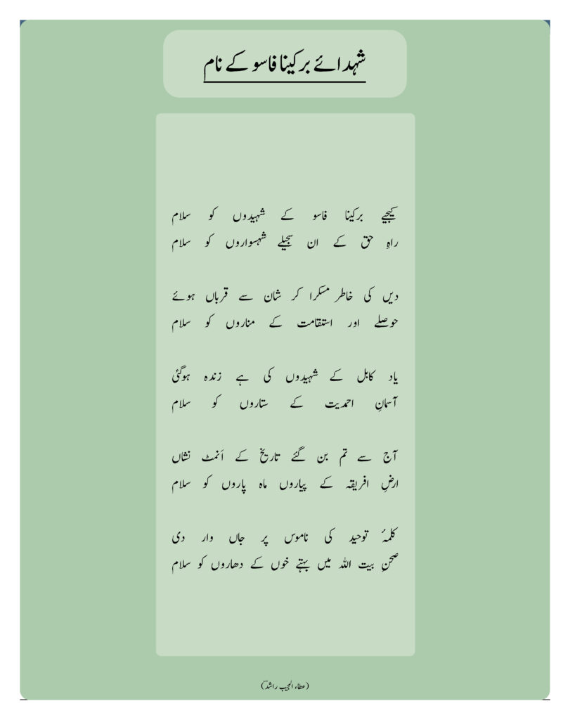 کیجیے برکینا فاسو کے شہیدوں کو سلام راہِ حق کے ان سجیلے شہسواروں کو سلام دیں کی خاطر مسکرا کر شان سے قرباں ہوئے حوصلے اور استقامت کے مناروں کو سلام یاد کابل کے شہیدوں کی ہے زندہ ہوگئی آسمانِ احمدیت کے ستاروں کو سلام آج سے تم بن گئے تاریخ کے اَنمٹ نشاں ارضِ افریقہ کے پیاروں ماہ پاروں کو سلام کلمۂ توحید کی ناموس پر جاں وار دی صحنِ بیت اللہ میں بہتے خوں کے دھاروں کو سلام