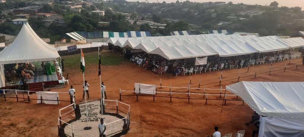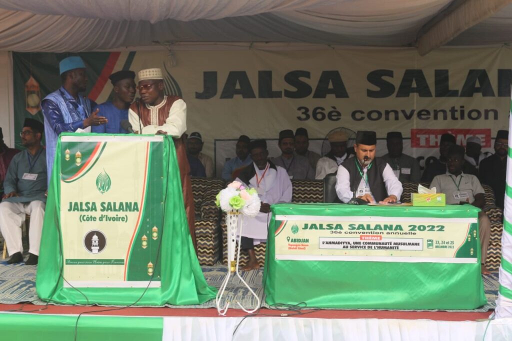 https://youtu.be/6N4Gmtz1IqY ٭…نماز تہجد،باجماعت نمازیں اور تربیتی موضوعات پر دروس ٭…علمائے سلسلہ کی تعلیمی و تربیتی موضوعات پر تقاریر ٭…مقامی اخبارات و ٹی وی چینلزمیں کوریج اللہ تعالیٰ کے فضل و کرم سے امسال جماعت احمدیہ آئیوری کوسٹ (Côte d Ivoire) کو کورونا کی عالمی وبا میں کمی کے بعد باقاعدہ طور پر جلسہ سالانہ کے انعقاد کی توفیق حاصل ہوئی۔ اس سے قبل ۲۰۱۹ء میں جلسہ منعقد کیا گیا تھا۔ گذشتہ سال نیشنل سطح پر جلسہ سالانہ کے انعقاد کی بجائے ریجنل سطح پر جلسہ جات منعقد کیے گئے تھے۔ تاہم امسال مورخہ ۲۳، ۲۴ اور ۲۵؍دسمبر ۲۰۲۲ء کو نیشنل جلسہ سالانہ بمقام مہدی آباد، آبی جان (Abidjan) بعنوان ’’احمدیت، خدمت انسانیت میں مشغول ایک جماعت‘‘ منعقد کیاگیا۔ جلسہ سالانہ کے انعقاد سے قبل مختلف مواقع پر امیر و مشنری انچارج آئیوری کوسٹ مکرم عبدالقیوم پاشا صاحب کی زیر صدارت نیشنل عاملہ نیز ریجنل مبلغین کرام کی میٹنگز بسلسلہ انعقاد جلسہ سالانہ کا بھی اہتمام کیا گیا جس میں جلسہ سالانہ کے متعلق تمام امور مثلاً پروگرام جلسہ، مقام جلسہ، مہمانان کرام کی آمدو رہائش، طعام نیز دیگر امور وغیرہ کا جائزہ لیا گیا۔ ناظم جلسہ سالانہ مکرم کریم جوارا (Karim Djawara) صاحب کی زیر نگرانی جلسہ کے لیے ایک کمیٹی تشکیل دی گئی۔ جلسہ کی تیاری کا سلسلہ مکرم امیر صاحب کی زیر ہدایت و نگرانی جلسہ کے ایام سے قبل ہی شروع کر دیا گیا تھا جس میں مہمانان حضرت مسیح موعودؑ کے طعام کے انتظام کے لیے اشیاء کی خریداری کی ذمہ داری نائب افسر جلسہ سالانہ مکرم لقمان احمد فرید صاحب مبلغ سلسلہ نیز مکرم احتشام الحسن صاحب مبلغ سلسلہ نے ادا کی نیز جلسہ گاہ کی تیاری کا کام بھی شامل تھا۔ وقار عمل کے ذریعے جلسہ گاہ کی صفائی کا انتظام کیا گیا جس میں مقامی خدام نیز معلمین کرام نے حصہ لیا۔ مہمانان کرام کی آمد اور معائنہ انتظامات جلسہ سے ایک روز قبل مورخہ 22؍دسمبر بروز جمعرات دوپہر کے بعد سے دور دراز کے ریجنز سے مہمانان کے قافلہ جات جلسہ گاہ پہنچنا شروع ہو گئے۔ اسی دوران جلسہ گاہ میں ٹینٹ وغیرہ نیز سٹیج کی تیاری کا کام بھی شروع کر دیا گیا۔ سٹیج کو جلسہ گاہ کے تھیم سے آراستہ بینرز کے ساتھ سجا یاگیا۔ نیز ٹینٹس میں مہمانان کرام کے بیٹھنے کے لیے کرسیوں کا انتظام کیا گیا۔ اس روز جلسہ کے مہمانوں کے لیے صبح سے ہی لنگر حضرت مسیح موعودؑ کا سلسلہ شروع کر دیا گیا تھا۔ مہمانان کرام کے طعام کے انتظام کے ساتھ ان کی رہائش کا انتظام ہیومینٹی فرسٹ کے زیر تعمیر ہسپتال کی عمارت نیز جماعتی موجودہ ہال نما مسجد میں کیا گیا جبکہ لجنہ اماء اللہ کی رہائش کا انتظام جماعتی سکول کے کمروں میں کیا گیا۔ نماز ظہر و عصر جمع کر کے ادا کی گئیں۔ شام چار بجے مکرم امیر صاحب نے جلسہ گاہ آکر تیاریوں کا معائنہ کیا نیز انتظامات سے متعلق ہدایات دیں۔ پھر نماز مغرب و عشاء ادا کی گئیں جس کے بعد اعلانات ہوئے اورآنے والے احباب کرام کو جلسہ کی اہمیت نیز جلسہ گاہ کے متعلق راہنمائی کی گئی۔ بعد ازاں طعام کا انتظام کیا گیا۔ جلسہ کا پہلا دن مورخہ ۲۳؍دسمبر بروز جمعۃ المبارک آئیوری کوسٹ کے ۳۶ویں جلسہ سالانہ کا پہلا دن تھا۔ چنانچہ جماعتی روایات کے مطابق جلسہ کے دن کا آغاز باجماعت نماز تہجد سے کیا گیا جو مکرم وترا عبدالرحمان صاحب معلم سلسلہ نے پڑھائی جس کے بعد نماز فجر ادا کی گئی اور درس بعنوان جلسہ سالانہ میں شرکت کی اہمیت دیا گیا۔ بعد ازاں شرکاء کو ناشتہ پیش کیا گیا۔ ناشتہ کے بعد جلسہ کی بقیہ تیاریوں کے ساتھ ساتھ شرکاء نے جلسہ کے پروگرام میں شرکت کی تیاری بھی شروع کر دی۔ جلسہ کے پروگرام کا اول حصہ حضور انورایدہ اللہ تعالیٰ بنصرہ العزیز کا براہ راست خطبہ جمعہ تھا جس کے لیے احباب کرام تیاری کر کے جلسہ گاہ پہنچ گئے۔ چنانچہ جلسہ میں تمام شرکاء نے حضور انورکا خطبہ جمعہ سنا خطبہ کے اختتام کے ساتھ ہی امیر صاحب نےمقامی طور پر خطبہ جمعہ بعنوان ’’جلسہ سالانہ کے اغراض و مقاصد‘‘دیا جس کے بعد نماز جمعہ و عصر باجماعت ادا کی گئیں۔ نمازوں کی ادائیگی کے بعد 