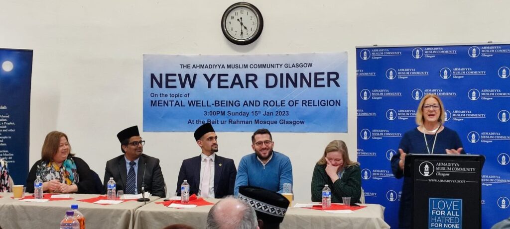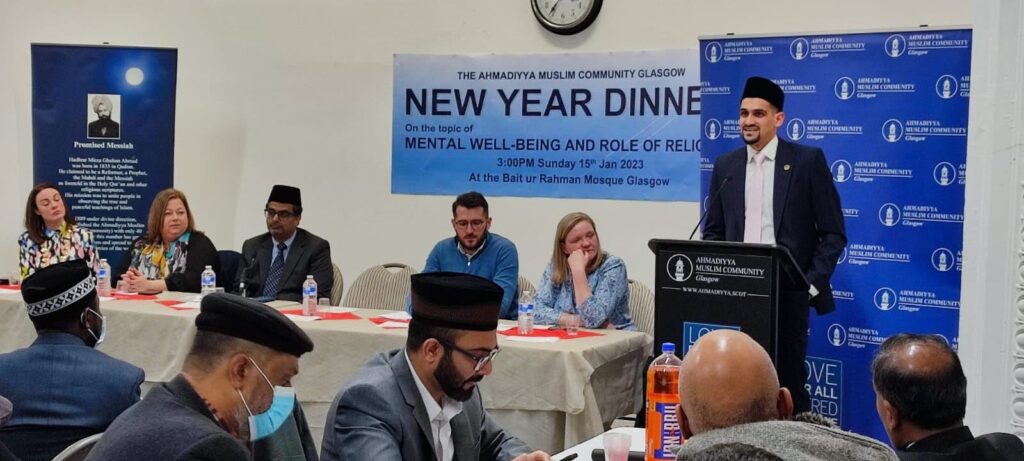 https://youtu.be/nxJAhBGWwig جماعت احمدیہ سکاٹ لینڈ ریجن کی ہمیشہ کوشش رہی ہے کہ یہاں کے مقامی لوگوں کو اسلام احمدیت کا پیغام دینے کا کوئی نہ کوئی موقع ملتا رہے۔ چنانچہ مختلف قسم کے پروگراموں کا انعقاد کیا جاتا رہتا ہے۔ جماعت احمدیہ گلاسگو پچھلے کئی سالوں سے نئے سال کے عشائیہ کا اہتمام کرتی ہے جس میں مقامی سیاستدان، طلبہ، فلاحی تنظیموں اور پولیس کے نمائندے، دوسرے مذاہب کے راہنما اور ہمسائے بخوشی شامل ہوتے ہیں۔ مورخہ ۱۵؍جنوری ۲۰۲۳ء بروز اتوار تین بجے اس عشائیہ کا اہتمام مسجد بیت الرحمٰن گلاسگو میں کیا گیا جس میں ۶۵ سے زائد غیر مسلم احباب شامل ہوئے۔ سوشل میڈیا کے استعمال سے ۹۰۰سے زائد سکاٹش لوگوں تک اس پروگرام کی تشہیر ہوئی، الحمدللہ۔اس عشائیہ کا موضوع ’’ذہنی صحت اور مذہب کا کردار‘‘ تھا۔ پروگرام کے انعقاد سے دو ماہ قبل ایک کمیٹی تشکیل دی گئی جس میں مختلف احباب جماعت کو ذمہ داریاں دی گئیں جیسے سیاستدانوں، پولیس اورمذہبی راہنماؤں کو دعوت، آڈیو ویڈیو، پریس، سوشل میڈیا، ہال کی تیاری اور کھانے کے انتظامات وغیرہ۔ اس کے لیے پچاس کے قریب احباب جماعت شامل ہوئے۔ پروگرام کے دعوت نامے سوشل میڈیا، ای میل کے علاوہ مسجد کے ہمسایوں میں بھی تقسیم کیے گئے اور اسی طرح دوسرے شاملین کے ساتھ رابطہ کیا گیا اور نئے سال کی مبارک باد کے جماعتی کارڈز بھی دیے گئے۔ مہمانوں کی آمد اور رجسٹریشن کے بعد اُن کی خدمت میں چائے، بسکٹ اور مشروبات پیش کیے گئے اور احباب جماعت مہمانوں کے ساتھ گھل مل گئے جہاں جماعت احمدیہ کا تعارف اور مسجد بیت الرحمٰن کی تاریخ وغیرہ کے متعلق بات چیت ہوئی۔ پروگرام کا آغاز تلاوت قرآن کریم اور انگریزی ترجمہ سے ہوا۔ بعد ازاں جماعت احمدیہ عالمگیرکی ایک تعارفی ویڈیو دکھائی گئی جس میں حضرت خلیفۃ المسیح الخامس ایدہ اللہ تعالیٰ بنصرہ العزیز کی امن قائم کرنے کی مساعی کا مختصر تعارف تھاعلاوہ ازیں سکاٹ لینڈ ریجن کی انسانیت کے لیے خدمات کا بھی ذکر ہوا۔ درج ذیل مقررین نے مختصر خطاب کیا اور پروگرام کے موضوع پر مزید روشنی ڈالی: Kirsten Oswald صاحبہ (MP East Renfrewshire) نے جماعت احمدیہ کی مقامی لوگوں کی خدمت پر تعریف کا اظہار کیا، جس نے مستحق لوگوں کی زندگیوں کو بدلنے میں اہم کردارادا کیا ہے۔ Paul Sweeney صاحب (MP گلاسگو ریجن) نے ہر سیاسی پلیٹ فارم پر ان لوگوں کے حق میں آواز اٹھانے کا عہد کیا جو ذہنی صحت کے کسی بھی مسئلے سے متاثر ہیں، خاص طور پر COVID کے وقت کے دوران۔ Colette McDiarmid صاحبہ (Provost Office, East Dunbartonshire) نے کہا کہ سکاٹش معاشرے کو متحرک اور پرامن بنانے میں اپنا کردار ادا کرنا بہت ضروری ہے جیسا کہ آپ کی جماعت کر رہی ہے۔ میں ایسٹ ڈنبارٹن شائر کے پرووسٹ کی طرف سے نئے سال کا پرتپاک پیغام دینا چاہوں گی جو آج کی تقریب میں شرکت نہیں کر سکے۔ Elain Weir صاحبہ (Founder of the charity Time & Space) نے ان منصوبوں کے بارے میں بتایا جو ان کی چیریٹی نے جاری رکھے ہوئے ہیں اور وہ احمدیہ مسلم کمیونٹی گلاسگو کے ساتھ کس طرح تعاون کرنے کی منتظر ہیں۔ مکرم ہمایوں جہانگیر خان صاحب (مربی سلسلہ گلاسگو )نے اپنی تقریر میں عالمی ادارہ صحت کی طرف سے شائع کردہ ذہنی صحت کے مفصل مفہوم کوبیان کیا اور بتایا کہ کس طرح اسلام کسی بھی ذہنی مسئلے کا حل قرآن پاک میں پیش کرتا ہے۔ انہوں نے مزید کہا کہ کس طرح رسول اللہ صلی اللہ علیہ وسلم مسجد میں تشریف لے جاتے، صحابہ کرام سے ملاقات کرتے اور رات کے وقت بھی عبادت کرتے جس سے آپ ﷺکسی بھی ذہنی صحت کے مسئلہ سے دوچار نہیں ہوئے حتیٰ کہ آپؐ پر عظیم الشان ذمہ داریاں بھی تھیں۔ ڈاکٹرعبدالحئی صاحب (ریجنل امیر) جو ایڈنبرا سے اس پروگرام میں شامل ہونے کے لیے آئے تھے انہوں نے ایک طبی پیشہ ور کے طور پرذہنی صحت اور اس کے مسائل پرمزید روشنی ڈالی، انہوں نے NHS کی شائع کردہ معلومات کی بنیاد پر ذہنی صحت کے مسائل کی حقیقی تصویر اور نتائج کو دکھایا۔ آپ نے کہا کہ کیسے آج کل کی مہنگائی اور کووڈ کی وبا کے نتیجے میں پیدا ہونے والے ذہنی خلفشارسے بچا جاسکتا ہے۔ ایک دلچسپ سوال وجواب کی نشست ہوئی
