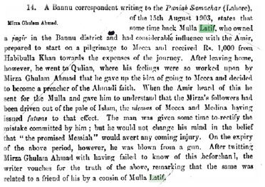 https://youtu.be/-sCRnhjTdfc پیدائش اورمقام ومرتبہ صاحبزادہ عبداللطیف صاحب کی پیدائش خوست افغانستان کے ایک قصبہ سید گاہ میں ہوئی تھی۔خاندانی تعلق حضرت داتا گنج بخش ؒسے تھا۔ آپ کے آباء ایران سے ہندوستان (سہارنپور) بعدازاں سیدگاہ افغانستان آکر آباد ہوئے۔آپ کا خاندان ایک وسیع و عریض رقبہ کا مالک تھا جس کی وجہ سے علاقہ میں اچھا خاصا اثر ورسوخ رکھتے تھے۔ صاحبزادہ صاحب ایک عالم باعمل شخصیت تھے۔ علم کی تڑپ کا اندازہ اس بات سے بھی کیا جاسکتا ہے کہ آپ تحصیل علم کے لیے دو بار ہندوستان کا سفر اختیار کرچکے تھے۔ جس کا مقصد قرآن کریم اور حدیث کا علم مختلف علماء سے حاصل کرنا تھا۔افغانستان واپس آکرآہستہ آہستہ علاقہ میں آپ کی ساکھ مضبوط ہوتی چلی گئی یہاں تک کہ آپ کا حلقہ احباب وسیع ہونا شروع ہوگیا۔ ایک انگریز سیاح/انجینئر مارٹن کے مطابق آپ کے تلامذہ ومتبعین کی تعداد 50 ہزار سے زائد تھی۔آپ کے اسی اثر کے باعث پہلے گورنر خوست سردار شیریں دل خان آپ کا گرویدہ ہوا اور بارہا آپ کے درس اور دیگر محفلوں میں آپ کے ارشادات سننے کا متلاشی رہا۔ چنانچہ بعض روایات کے مطابق ایک دفعہ گورنر خوست نے آپ کو اپنے گھر دعوت طعام پر بلایا۔ کھانے کی طشتری جب اندر زنان خانہ سے مہمان خانہ میں آئی تو اس میں ایک رقعہ موجود تھا جس میں گورنر کی بیوی نے صاحبزادہ صاحب سے دعا کی درخواست کے ساتھ آپ کی آمد پر خوشنودی کا اظہار کیا تھا۔اور بیعت کی خواہش کااظہارکیاتھا۔ یہ جان کر گورنر کو خود بھی بہت مسرت ہوئی کہ میرے گھر میں بھی خداتعالیٰ نے اسلام سے رغبت ڈال رکھی ہے اور صاحبزادہ صاحب کی عقیدت کا احساس ہے۔چنانچہ اس نے کہا ’’الحمدللہ ہمارے گھروالوں کوبھی خداسےملنے کاشوق ہے‘‘۔(سیدالشہداء از صاحبزادہ جمیل لطیف صفحہ53) اسی مرتبہ اور مقام کا ذکر کرتے ہوئے حضرت اقدسؑ نے فرمایا: ’’وہ امیر کابل کی نظرمیں ایک برگزیدہ عالم اور تمام علماء کے سردار سمجھے جاتے تھے ‘‘۔ (تذکرۃ الشہادتین،روحانی خزائن جلد 20مطبوعہ لندن صفحہ 10) چنانچہ بعض معاملات میں گورنر کو اسلامی تعلیمات کے مطابق فیصلہ جات کے لیے آپ کی ضرورت محسوس ہوئی جس کے لیے اس نے امیر افغانستان کو لکھوا بھیجا۔ امیر نے جواباً صاحبزادہ صاحب کو گورنر کی درخواست کے برعکس اپنے پاس اپنے دربار میں رکھنے کا ارادہ کرلیا چنانچہ آپ کو بمع اہل وعیال بھرپور عزت وتکریم کے ساتھ کابل لے جایا گیا۔یوں آپ نے امیر افغانستان کے لیے بلکہ اپنے ملک افغانستان کے لیے خدمت کا آغاز کیا۔ البتہ امیر کی خواہش تھی کہ آپ کو قاضی القضاة لگایا جائے، آپ نے یہ شرط قبول نہ کی اور بغیر کسی عہدہ کے اس کے دربار کے معاملات میں اپنی آرا وغیرہ کا اظہار کرتے رہے۔ اسی کام سے متعلق آپ فرمایاکرتے تھے کہ میرا مقصد مظلوم عوام کو ظالم بادشاہ کے مظالم سے بچانا ہے۔ اسی لیے میں اس کے ساتھ معاونت کرتا ہوں تا غلط کام کی نشاندہی کرسکوں۔ایک واقعہ آپ بیان فرماتے تھے کہ ایک دفعہ امیر عبدالرحمٰن کے ساتھ میں کسی فیصلہ کے لیے بیٹھا ہوا تھا۔ میرا معمول تھا کہ جب مجھ سے پوچھا جائے تو میں درست فیصلہ کی صورت میں ہاں میں جواب دیتا تھا اور غلط فیصلہ کی صورت میں انشاءاللہ کہتا تھا۔ چنانچہ اس فیصلہ کی بابت مجھے لگا کہ یہ درست نہیں، تو میں نے انشاء اللہ کہا۔ اس پر عبدالرحمٰن کو شدید غصہ آیا اور چیخ کر بولا کہ نہیں چاہتا عبدالرحمٰن انشاء اللہ۔آپ فرماتے تھے کہ کس قدر ظالم اور گمراہ ہے یہ شخص۔(سیدالشہداء از صاحبزادہ جمیل لطیف صفحہ67)چنانچہ اسی مقام ومرتبہ کے باعث آپؓ پر حکومت اور بادشاہ وقت کو بھرپور اطمینان تھا اور اسی وجہ سے آپ کو ڈیورنڈ لائن / حدبندی کے لیے افغان نمائندہ بناکر بھجوایا گیا تھا۔ ڈیورنڈ لائن کا پس منظر 1870ء کے اواخر میں دیگر اہم معاملات کے علاوہ انگریزوں نے اپنے علاقے (متحدہ ہندوستان) کی سالمیت کے لیے یہ فیصلہ کیا کہ ہندوستان اور افغانستان کے درمیان ایک سرحد قائم کرلی جائے۔جس کا مقصد حد بندی اور افواج کو باز رکھنا تھا۔اور جس نےدراصل ہندوستان اور روس کے درمیان بفرزون کا