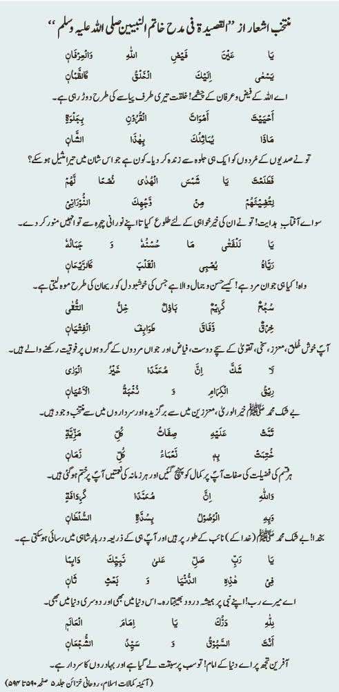 یَا عَیْنَ فَیْضِ اللّٰہِ وَالْعِرْفَانٖ یَسْعٰی اِلَیْکَ الْخَلْقُ کَالظَّمْاٰنٖ اے اللہ کے فیض و عرفان کے چشمے! خلقت تیری طرف پیاسے کی طرح دوڑ رہی ہے۔ أَحْیَیْتَ أَمْوَاتَ الْقُرُوْنِ بِجَلْوَةٍ مَاذَا یُمَاثِلُکَ بِھٰذَا الشَّانٖ تو نے صدیوں کے مُردوں کو ایک ہی جلوہ سے زندہ کر دیا۔ کون ہے جو اس شان میں تیرا مثیل ہوسکے؟ فَطَلَعْتَ یَا شَمْسَ الْھُدٰی نُصْحًا لَّھُمْ لِتُضِیْئَھُمْ مِنْ وَّجْھِکَ النُّوْرَانِیْ سو اے آفتاب ِ ہدایت! تو نے ا ن کی خیر خواہی کے لئے طلوع کیا تا اپنے نورانی چہرہ سے تو انہیں منور کر دے۔ یَا لَلْفَتٰی مَا حُسْنُہٗ وَ جَمَالُہٗ رَیَّاہُ یُصْبِی الْقَلْبَ کَالرَّیْحَانٖ واہ! کیا ہی جوان مرد ہے ! کیسے حسن و جمال و الا ہے جس کی خوشبو دل کو ریحان کی طرح موہ لیتی ہے۔ سُجُحٌ کَرِیْمٌ بَاذِلٌ خِلُّ التُّقٰی خِرْقٌ وَّفَاقَ طَوَائِفَ الْفِتْیَانٖ آپؐ خوش خُلق، معزز، سخی، تقویٰ کے سچے دوست، فیاض اور جواں مردوں کے گروہوں پر فوقیت رکھنے والے ہیں۔ لَا شَکَّ اِنَّ مُحَمَّدًا خَیْرُ الْوَرٰی رِیْقُ الْکِرَامِ وَ نُخْبَةُ الْأَعْیَانٖ بے شک محمد ﷺ خیر الوریٰ ، معززین میں سے برگزیدہ اور سرداروں میں سے منتخب وجود ہیں۔ تَمَّتْ عَلَیْہِ صِفَاتُ کُلِّ مَزِّیَّةٍ خُتِمَتْ بِہٖ نَعْمَاءُ کُلِّ زَمَانٖ ہر قسم کی فضیلت کی صفات آپؐ پر کمال کو پہنچ گئیں اور ہر زمانہ کی نعمتیں آپؐ پر ختم ہو گئی ہیں۔ وَاللّٰہِ اِنَّ مُحَمَّدًا کَرِدَافَةٍ وَبِہِ الْوُصُوْلُ بِسُدَّةِ السُّلْطَانٖ بخدا! بے شک محمد ﷺ (خدا کے ) نائب کے طور پر ہیں اور آپؐ ہی کے ذریعہ دربارِ شاہی میں رسائی ہو سکتی ہے۔ یَا رَبِّ صَلِّ عَلیٰ نَبِیِّکَ دَائِمًا فِیْ ھٰذِہِ الدُّنْیَا وَ بَعْثٍ ثَانٖ اے میرے رب! اپنے نبی پر ہمیشہ درود بھیجتا رہ۔ اس دنیا میں بھی اور دوسری دنیا میں بھی۔ لِلّٰہِ دَرُّکَ یَا اِمَامَ الْعَالَمٖ أَنْتَ السَّبُوْقُ وَ سَیِّدُ الشُّجْعَانٖ آفرین تجھ پر اے دنیا کے امام! تو سب پر سبقت لے گیا ہے اور بہادروں کا سردار ہے۔ (آئینہ کمالات اسلام، روحانی خزائن جلد۵ صفحہ۵۹۰تا ۵۹۴)