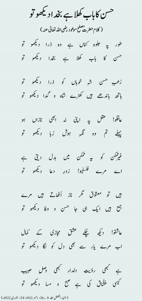 (کلام حضرت مصلح موعود رضی اللہ تعالیٰ عنہ) طور پہ جلوہ کناں ہے وہ ذرا دیکھو توحسن کا باب کھلا ہے بخدا دیکھو تو رُعبِ حسن شہِ خوباں کو ذرا دیکھو توہاتھ باندھے ہیں کھڑے شاہ و گدا دیکھو تو عاقلو! عقل پہ اپنی نہ ابھی نازاں ہوپہلے تم وہ نگہِ ہوش رُبا دیکھو تو غیرممکن کو یہ ممکن میں بدل دیتی ہےاے مرے فلسفیو! زورِ دعا دیکھو تو ہیں تو معشوق مگر ناز اُٹھاتے ہیں مرےجمع ہیں ایک ہی جا حسن و وفا دیکھو تو عاشقو! دیکھ چکے عشقِ مجازی کے کمالاب مرے یار سے بھی دل کو لگا دیکھو تو ہے کبھی رؤیتِ دلدار کبھی وصلِ حبیبکیسی عُشَّاق کی ہے صبح و مسا دیکھو تو ( اخبار الفضل جلد 9 ۔26؍ دسمبر1921ء تا 2؍ جنوری 1922ء)
