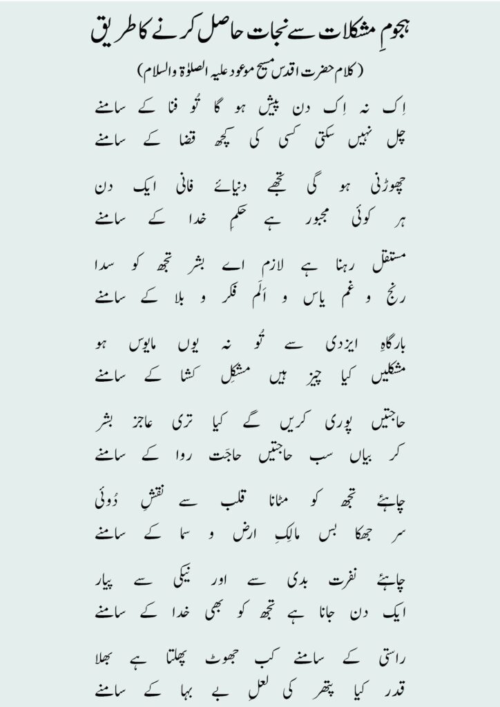 (کلام حضرت اقدس مسیح موعود علیہ الصلوٰۃ والسلام) اِک نہ اِک دن پیش ہو گا تُو فنا کے سامنےچل نہیں سکتی کسی کی کچھ قضا کے سامنے چھوڑنی ہو گی تجھے دنیائے فانی ایک دنہر کوئی مجبور ہے حکمِ خدا کے سامنے مستقل رہنا ہے لازم اے بشر تجھ کو سدارنج و غم یاس و اَلَم فکر و بلا کے سامنے بارگاہِ ایزدی سے تُو نہ یوں مایوس ہومشکلیں کیا چیز ہیں مشکِل کشا کے سامنے حاجتیں پوری کریں گے کیا تری عاجز بشرکر بیاں سب حاجتیں حاجَت روا کے سامنے چاہئے تجھ کو مٹانا قلب سے نقشِ دُوئیسر جھکا بس مالِکِ ارض و سما کے سامنے چاہئے نفرت بدی سے اور نیکی سے پیارایک دن جانا ہے تجھ کو بھی خدا کے سامنے راستی کے سامنے کب جھوٹ پھلتا ہے بھلاقدر کیا پتھر کی لعلِ بے بہا کے سامنے
