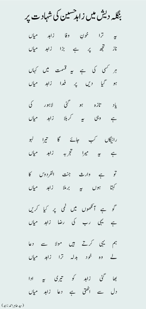یہ ترا خونِ وفا زاہد میاںناز تجھ پر ہے بڑا زاہد میاں ہر کسی کی ہے یہ قسمت میں کہاںہو گیا دیں پر فدا زاہد میاں یاد تازہ ہو گئی لاہور کیہے وہی یہ کربلا زاہد میاں رائیگاں کب جائے گا تیرا لہوہے یہ میرا تجربہ زاہد میاں تو ہے وارث جنت الفردوس کاکہتا ہوں یہ برملا زاہد میاں گو ہے آنکھوں میں نمی پر کیا کریںہے یہی رب کی رضا زاہد میاں ہم یہی کرتے ہیں مولا سے دعالے وہ خود بدلہ ترا زاہد میاں بھا گئی زاہد کو تیری یہ ادادل سے اٹھتی ہے دعا زاہد میاں (سید طاہر احمد زاہد)