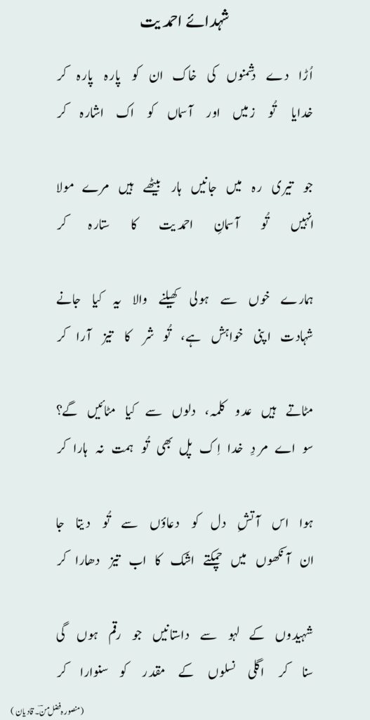 اُڑا دے دشمنوں کی خاک ان کو پارہ پارہ کرخدایا تُو زمیں اور آسماں کو اک اشارہ کر جو تیری رہ میں جانیں ہار بیٹھے ہیں مرے مولاانہیں تُو آسمانِ احمدیت کا ستارہ کر ہمارے خوں سے ہولی کھیلنے والا یہ کیا جانےشہادت اپنی خواہش ہے، تُو شر کا تیز آرا کر مٹاتے ہیں عدو کلمہ، دلوں سے کیا مٹائیں گے؟سو اے مردِ خدا اِک پل بھی تُو ہمت نہ ہارا کر ہوا اس آتشِ دل کو دعاؤں سے تُو دیتا جاان آنکھوں میں چمکتے اشک کا اب تیز دھارا کر شہیدوں کے لہو سے داستانیں جو رقم ہوں گیسنا کر اگلی نسلوں کے مقدر کو سنوارا کر