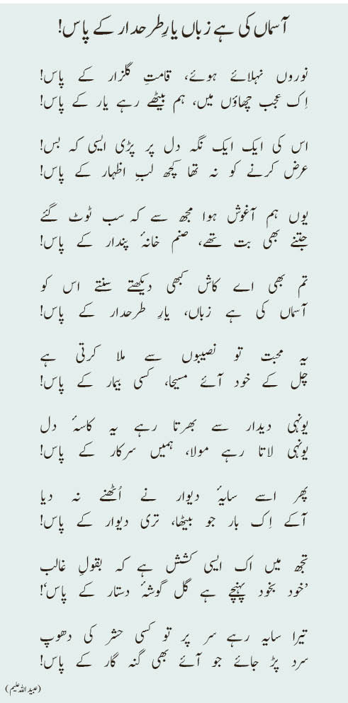 نوروں نہلائے ہوئے، قامتِ گلزار کے پاس! اِک عجب چھاؤں میں، ہم بیٹھے رہے یار کے پاس! اس کی ایک ایک نگہ دل پر پڑی ایسی کہ بس! عرض کرنے کو نہ تھا کچھ لبِ اظہار کے پاس! یوں ہم آغوش ہوا مجھ سے کہ سب ٹوٹ گئے جتنے بھی بت تھے، صنم خانۂ پندار کے پاس! تم بھی اے کاش کبھی دیکھتے سنتے اس کو آسماں کی ہے زباں، یارِ طرحدار کے پاس! یہ محبت تو نصیبوں سے ملا کرتی ہے چل کے خود آئے مسیحا، کسی بیمار کے پاس! یونہی دیدار سے بھرتا رہے یہ کاسۂ دل یونہی لاتا رہے مولا، ہمیں سرکار کے پاس! پھر اسے سایۂ دیوار نے اُٹھنے نہ دیا آکے اِک بار جو بیٹھا، تری دیوار کے پاس! تجھ میں اک ایسی کشش ہے کہ بقولِ غالب ’خود بخود پہنچے ہے گل گوشۂ دستار کے پاس‘! تیرا سایہ رہے سر پر تو کسی حشر کی دھوپ سرد پڑ جائے جو آئے بھی گنہ گار کے پاس! (عبید اللہ علیم )