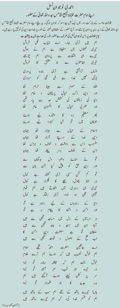 خلافتِ خامسہ کے بابرکت دور میں ایک نسل پیدا ہو کر جوان ہوگئی۔ یہ بچے اپنے امام حضرت خلیفۃ المسیح الخامس ایدہ اللہ تعالیٰ کے زیرِ سایہ پروان چڑھے اور آج حضور کے سلطانانِ نصیر کے طور پر خدمتِ دین کی توفیق پا رہے ہیں۔ یومِ خلافت پر اِس نوجوان نسل کی طرف سے حضور انور کی خدمت میں ہدیۂ عقیدت ہم ہیں تری بہار، اے نایاب گُل فروش تیری محبتوں میں سنبھالا ہے ہم نے ہوش تیرے ہی التفات سے پروان ہم چڑھے تیری اطاعتوں سے ملا عشق کا خروش انساں تراشتی ہے تری بندہ پروری یونہی نہیں خدا سے ملی تجھ کو سروری الحاد کے سموم سے جینا حرام تھا اور دِین اِک خیالِ پریشان و خام تھا دنیا کی زینتوں کی کشش حد سے پار تھی اور مغربی خیال کا افسون عام تھا پھر مستقیم رَہ کا اشارہ لیے ہوئے طوفان میں تُو آیا کنارا لیے ہوئے اِسلام کے خیال سے بیزار تھا جہان دینِ خدا کے درپئے آزار تھا جہان منسوب اِس سے دہشت و خوف و ہراس تھا اِس کے خلاف برسرِ پیکار تھا جہان تُو نے مٹائے وہم، دلِ بدگمان سے اور دینِ حق کو پیش کیا آن بان سے تُو کم سُخن سہی تری گفتار ہے کمال ہر لفظ پھول، لہجے کا گلزار ہے کمال تیری ہی رہبری میں اٹھاتے ہیں ہم قدم جیسی بھی ہو ہَوا، تری رفتار ہے کمال دنیا کے رہبروں کے لیے راہبر ہے تُو اور امن و اتحاد کا پیغام بر ہے تُو ہر سرزمیں کے دِل میں مساجد تجھی سے ہیں آباد اِن میں زاہد و عابد تجھی سے ہیں سلطان تُو ہے سلطنتِ دینِ امن کا اب فتح کے اصول و قواعد تجھی سے ہیں اے جانشینِ حضرت احمدؑ تجھے سلام ہم خوش نصیب ہیں کہ ہوئے ہم ترے غلام خوش بخت ہم کہ قافلہ سالار تُو ہُوا دَر تیرہ، تار شب، سحر آثار تُو ہُوا سر پر کفن لپیٹے ہوئے آگئے ہیں ہم بدرِ جدید کا جو عَلمدار تُو ہُوا ہاں! تیرے ہاتھ کے تلے ہم سب کے ہاتھ ہیں ہم کو قسم خدا کی، کہ ہم تیرے ساتھ ہیں (آصف محمود باسط)