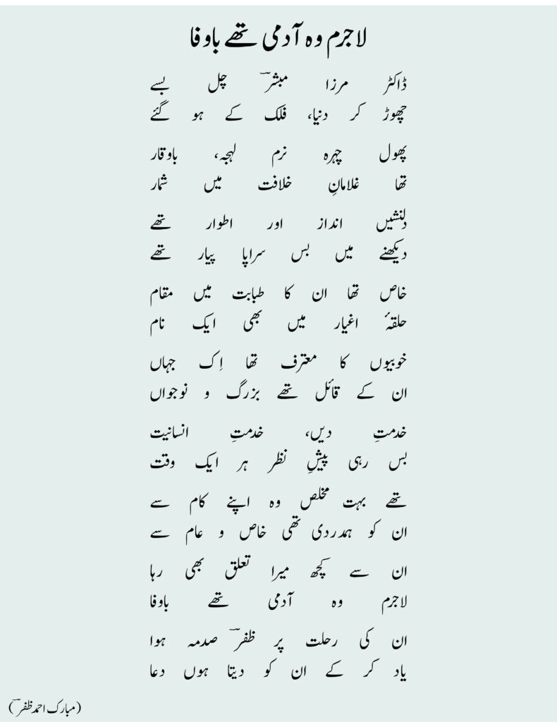 ڈاکٹر مرزا مبشرؔ چل بسے چھوڑ کر دنیا، فلک کے ہو گئے پھول چہرہ نرم لہجہ، باوقار تھا غلامانِ خلافت میں شمار دلنشیں انداز اور اطوار تھے دیکھنے میں بس سراپا پیار تھے خاص تھا ان کا طبابت میں مقام حلقۂ اغیار میں بھی ایک نام خوبیوں کا معترف تھا اِک جہاں ان کے قائل تھے بزرگ و نوجواں خدمتِ دیں، خدمتِ انسانیت بس رہی پیشِ نظر ہر ایک وقت تھے بہت مخلص وہ اپنے کام سے ان کو ہمدردی تھی خاص و عام سے ان سے کچھ میرا تعلق بھی رہا لاجرم وہ آدمی تھے باوفا ان کی رحلت پر ظفرؔ صدمہ ہوا یاد کر کے ان کو دیتا ہوں دعا (مبارک احمد ظفرؔ )