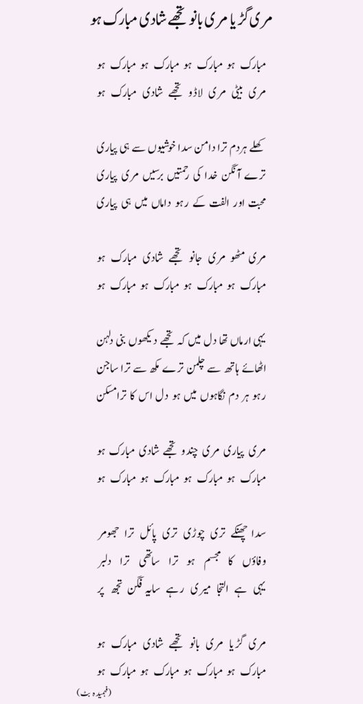 مبارک ہو مبارک ہو مبارک ہو مبارک ہومری بیٹی مری لاڈو تجھے شادی مبارک ہو کھلے ہردم ترا دامن سدا خوشیوں سے ہی پیاریترے آنگن خدا کی رحمتیں برسیں مری پیاریمحبت اور الفت کے رہو داماں میں ہی پیاری مری مٹھو مری جانو تجھے شادی مبارک ہومبارک ہو مبارک ہو مبارک ہو مبارک ہو یہی ارماں تھا دل میں کہ تجھے دیکھوں بنی دلہناٹھائے ہاتھ سے چلمن ترے مکھ سے ترا ساجنرہو ہر دم نگاہوں میں ہو دل اس کا ترا مسکن مری پیاری مری چندو تجھے شادی مبارک ہومبارک ہو مبارک ہو مبارک ہو مبارک ہو سدا چھنکے تری چوڑی تری پائل ترا جھومروفاؤں کا مجسم ہو ترا ساتھی ترا دلبریہی ہے التجا میری رہے سایہ فگن تجھ پر مری گڑیا مری بانو تجھے شادی مبارک ہومبارک ہو مبارک ہو مبارک ہو مبارک ہو