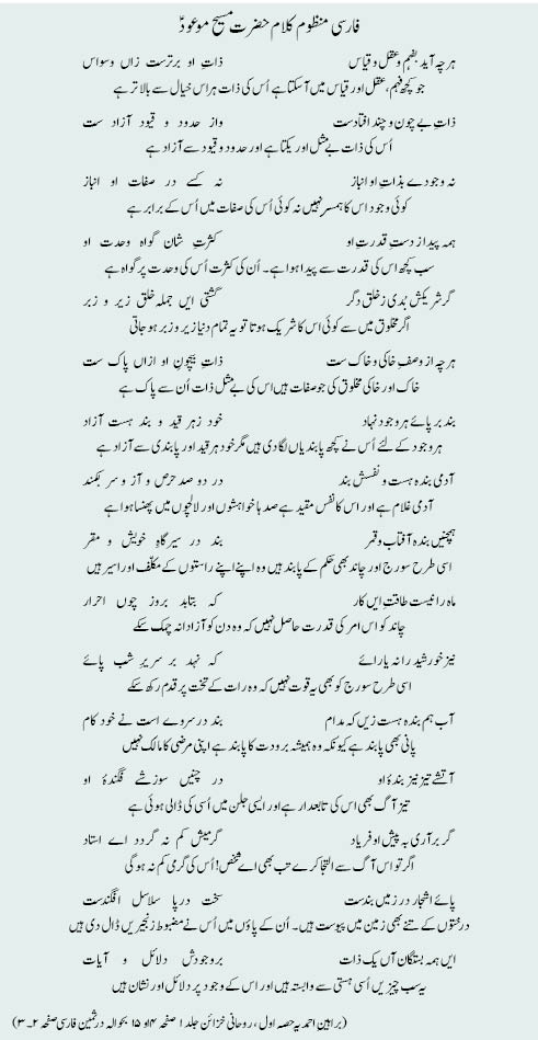 ہرچہ آید بفہم و عقل و قیاس ذاتِ او برترست زاں وسواس جو کچھ فہم، عقل اور قیاس میں آسکتا ہے اُس کی ذات ہراس خیال سے بالا تر ہے ذاتِ بے چون و چند افتادست واز حدود و قیود آزاد ست اُس کی ذات بے مثل اور یکتا ہے اور حدود و قیود سے آزاد ہے نہ وجودے بذاتِ او انباز نہ کسے در صفات او انباز کوئی وجود اس کا ہمسر نہیں نہ کوئی اُس کی صفات میں اُس کے برابر ہے ہمہ پیدا ز دستِ قدرتِ او کثرتِ شان گواہ وحدت او سب کچھ اس کی قدرت سے پیدا ہوا ہے۔ اُن کی کثرت اُس کی وحدت پر گواہ ہے گر شریکش بُدی ز خلق دگر گشتی ایں جملہ خلق زیر و زبر اگر مخلوق میں سے کوئی اس کا شریک ہوتا تو یہ تمام دنیا زیر و زبر ہو جاتی ہرچہ از وصفِ خاکی و خاک ست ذاتِ بیچونِ او ازاں پاک ست خاک اور خاکی مخلوق کی جوصفات ہیںاس کی بے مثل ذات اُن سے پاک ہے بند بر پائے ہر وجود نہاد خود زہر قید و بند ہست آزاد ہر وجود کے لئے اُس نے کچھ پابندیاں لگا دی ہیں مگر خود ہر قید اور پابندی سے آزاد ہے آدمی بندہ ہست و نفسش بند در دو صد حرص و آز و سر بکمند آدمی غلام ہے اور اس کا نفس مقید ہے صد ہا خواہشوں اور لالچوں میں پھنسا ہوا ہے ہمچنیں بندہ آفتاب و قمر بند در سیرگاہِ خویش و مقر اسی طرح سورج اور چاند بھی حکم کےپابند ہیں وہ اپنےاپنے راستوں کےمکلّف اوراسیرہیں ماہ را نیست طاقتِ ایں کار کہ بتابد بروز چوں احرار چاند کو اس امر کی قدرت حاصل نہیں کہ وہ دن کو آزادانہ چمک سکے نیز خورشید را نہ یارائے کہ نہد بر سریرِ شب پائے اسی طرح سورج کو بھی یہ قوت نہیں کہ وہ رات کے تخت پر قدم رکھ سکے آب ہم بندہ ہست زیں کہ مدام بند در سروے است نے خود کام پانی بھی پابند ہے کیونکہ وہ ہمیشہ برودت کا پابند ہے اپنی مرضی کا مالک نہیں آتشے تیز نیز بندئہ او در چنیں سوزشے فگندئہ او تیز آگ بھی اس کی تابعدار ہےاور ایسی جلن میں اُسی کی ڈالی ہوئی ہے گر برآری بہ پیش او فریاد گرمیش کم نہ گردد اے استاد اگر تو اس آگ سے التجا کرے تب بھی اے شخص! اُس کی گرمی کم نہ ہوگی پائے اشجار در زمیں بندست سخت درپا سلاسل افگندست درختوں کے تنے بھی زمین میں پیوست ہیں۔ اُن کے پاؤں میں اُس نے مضبوط زنجیریں ڈال دی ہیں ایں ہمہ بستگان آں یک ذات بروجودش دلائل و آیات یہ سب چیز یں اُسی ہستی سے وابستہ ہیں اور اس کے وجود پر دلائل اور نشان ہیں (براہینِ احمدیہ حصہ اول ، روحانی خزائن جلد ۱ صفحہ ۱۴و ۱۵ بحوالہ درثمین فارسی صفحہ ۲۔۳)