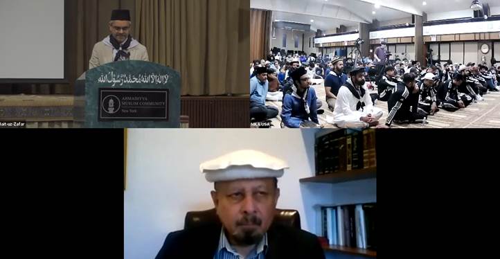 https://youtu.be/-3p__nrZN44 اللہ تعالیٰ کے فضل و کرم سے مجلس خدام الاحمدیہ امریکہ کے زیر اہتمام ۲۷؍ مئی ۲۰۲۳ء کو مسجد بیت الظفر نیو یارک میں نیشنل جلسہ یوم خلافت منعقد کیا گیا اور آن لائن بھی نشر کیا گیا۔ اس پروگرام کا اہتمام مسرور انٹرنیشنل سپورٹس ٹورنامنٹ ۲۰۲۳ء کے پہلے روزکیا گیا جس میں چھ ملکوں کی ٹیمیں شامل تھیں۔ پروگرام کا آغاز مکرم صاحبزادہ ڈاکٹر مرزا مغفور احمد صاحب امیر جماعت امریکہ کی صدارت میں تلاوت قرآن کریم، حدیث اور نظم سے ہوا۔ مدیل عبداللہ صاحب صدر مجلس خدام الاحمدیہ امریکہ کے افتتاحی کلمات کے بعد خاکسار(مہتمم تربیت) نے ایک پریزنٹیشن پیش کی جس میں ہماری زندگیوں میں خلافت کی ضرورت پر روشنی ڈالی گئی۔ اسی طرح چند خدام نے اپنے ذاتی تجربات اور مشاہدات بیان کیے کہ کس طرح خلافت نے ان کی زندگیوں میں انقلابی اثرات مرتب کیے ہیں۔ ایک حدیث اور خلافت کے حوالہ سے حضرت مسیح موعودؑ اور حضرت مصلح موعودؓ کے اقتباسات پیش کیے جانے کے بعد جہیم تھامس صاحب (نو مبائع) نے اپنی بیعت کی تفصیل بیان کی۔اس کے بعد حضور انورایدہ اللہ تعالیٰ بنصرہ العزیز کا ایک اقتباس سنایا گیا۔ بعدہٗ مسعود خان صاحب نے حضور انور ایدہ اللہ تعالیٰ بنصرہ العزیز کو خط لکھنے کی برکات کے حوالےسےخلافت اور دعاؤں کی قبولیت سے متعلق اپنے ذاتی تجربات بتائے۔ پھر نائب صدر خدام الاحمدیہ امریکہ مکرم ھبة الحمید اقبال صاحب نے اپنے ذاتی تجربات کی روشنی میں بتایا کہ کس طرح خلافت کی ڈھال میں آکر خدام خود کو دجال سے بچا سکتے ہیں۔ سراج بھٹی صاحب نے خلافت کے بارے میں اپنے ذاتی تجربات کا ذکر کیا اور بتایا کہ کس طرح انہوں نے کرپٹو کرنسی پر حضور انور کی ہدایات کے ذریعے خلافت کی الٰہی حیثیت کو صحیح معنوں میں سمجھا۔ حضور انور ایدہ اللہ تعالیٰ کا ایک اقتباس پیش کیے جانے کے بعد زارک خان صاحب نے ماہ رمضان کے دوران اسلام آباد میں وقفِ عارضی کے متعلق اپنے تجربات بیان کیے۔ پریزنٹیشن کا اختتام حضور انور ایدہ اللہ تعالیٰ بنصرہ العزیز کے خدام الاحمدیہ جرمنی سے خطاب کے ایک اقتباس کے ساتھ ہوا جس میں حضورانور ایدہ اللہ تعالیٰ بنصرہ العزیز نے خدام الاحمدیہ کے ایک مقصد حفاظت خلافت پر روشنی ڈالی اور فرمایا کہ نوجوانوں کی اصلاح اس چیز میں مضمر ہے کہ وہ خلیفہ کے حکم کو سنیں اور اس کی اطاعت کریں اور دعا کی کہ خدام الاحمدیہ خلافت کی حفاظت ان معنوں میں کریں۔ پروگرام کے اختتام پر مکرم امیر صاحب نے تقریر کی جس میں خلافت کی عظیم حیثیت اور اس کی اہمیت سمجھائی۔ صدر صاحب مجلس خدام الاحمدیہ نے مسرور انٹرنیشنل سپورٹس ٹورنامنٹ کے مہمانوں کو چند تحائف پیش کیے جس کے بعد مکرم امیر صاحب نے اختتامی دعا کروائی۔ پروگرام یوٹیوب پرموجود ہے اور نیچے دیے گئے لنک کے ذریعے دیکھا جا سکتا ہے۔ https://khudd.am/khilafatday2023 جلسہ یوم خلافت میں چار صد حاضرین نے بیت الظفر نیویارک میں شرکت کی جبکہ تین ہزار کے قریب حاضرین نے آن لائن شمولیت کی۔ ٭…٭…٭