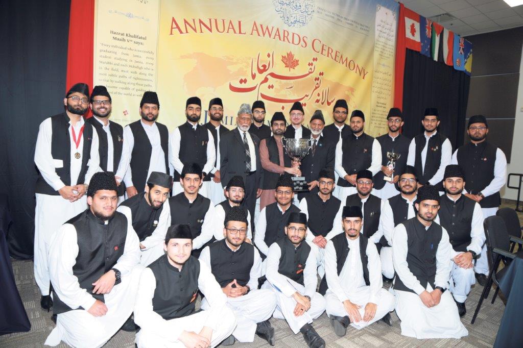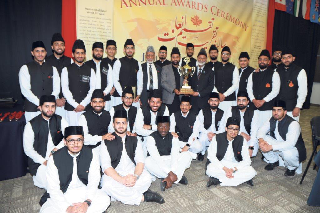 مورخہ ۱۵؍ جون ۲۰۲۳ء کو جامعہ احمدیہ اور حفظ القرآن سکول کینیڈا کی سالانہ تقریب تقسیم انعامات ایوانِ طاہر میں چھ بجے سہ پہر منعقد ہوئی جس کی صدارت محترم لال خان ملک صاحب امیر جماعت احمدیہ کینیڈا نے کی۔ اس تقریب میں جامعہ کے طلبہ،ان کے والدین نیز حفاظ کرام اوران کے والدین کے علاوہ جماعت کینیڈا کے بہت سے مرکزی اور لوکل عہدیداران نے شرکت کی۔تلاوت قرآن کریم، نظم، قصیدہ اوران کے انگریزی ترجمہ کے بعد مجلس علمی کی سرگرمیوں کی رپورٹ عزیزم حاشرہود احمد نائب انچارج مجلس علمی نے پیش کی۔ مکرم امیر صاحب تقریر کرتے ہوئے مختصر سالانہ کارگزاری رپورٹ میں جامعہ کی تاریخ کے ساتھ نصابی و غیر نصابی سرگرمیوں کا تذکرہ کیا گیا۔ بتایا گیا کہ جامعہ ۲۰۰۳ء میں قائم ہوا تھا اور۲۰۱۰ء میں پہلا بیچ(Batch) فارغ التحصیل ہوا تھا۔امسال کے آٹھ طلبہ کو ملا کر گیارہ ممالک کے ۱۴۳ مبلغین میدان عمل میں پہنچ چکے ہیں۔ دوران سال جامعہ کی مصروفیات کاذکر کرتے ہوئےبتایا گیا کہ جامعہ کی سپورٹس ٹیم نے مسرور انٹرنیشنل ساکر(فٹ بال ) ٹورنامنٹ یوکے اور مسرور انٹرنیشنل سپورٹس ٹورنامنٹ امریکہ میں شمولیت کی توفیق پائی۔ اسی طرح سکیئنگ ٹرپ (Skiing Trip)، پکنک،عربی اور اردو زبان کے کیمپس کا انعقاد کیاگیا۔دوران سال مختلف اہم مواقع پر جلسوں کا اہتمام کیا گیا اس کے ساتھ ساتھ مختلف اہم موضوعات پر مہمانوں نے جامعہ میں آکر لیکچرز دیے۔ جامعہ کے طلبہ کو مختلف جماعتی تربیتی اور تبلیغی تقاریب میں شمولیت کے ساتھ ساتھ اہم جماعتی مواقع جیسے تربیتی کیمپس،مجلس شوریٰ اور جلسہ سالانہ وغیرہ پر بھرپور ڈیوٹیاں سر انجام دینے کی توفیق ملی۔ امسال طلبہ کو دس دن تک جاری رہنے والی،اسلامی کتب پر مبنی ایک کامیاب نمائش کے انعقاد کی بھی توفیق ملی جو مورخہ ۲۸؍ اپریل تا۷ مئی ۲۰۲۳ء جاری رہی۔ جامعہ کے طلبہ اور اساتذہ کی خوش بختی تھی کہ ان کی ایک کثیر تعداد کو حضورانورایدہ اللہ کے دورہ امریکہ ۲۰۲۲ء کے دوران زائن،ڈیلس اور میری لینڈ میں حضور انور ایدہ اللہ کی بابرکت صحبت سے فیضیاب ہونے کی توفیق ملی۔ یہ امر قابل ذکر ہے کہ جامعہ احمدیہ کینیڈا میں مجلس علمی کے تحت شعبہ علمی مقابلہ جات،شعبہ ارشاد،شعبہ اشاعت اور شعبہ سیمینارز قائم ہے۔ ہر شعبہ کا نگران جامعہ کا ایک استاد جبکہ سیکرٹری طالبعلم ہے۔ نگران مجلس علمی کے طور پر محترم سہيل احمد ثاقب صاحب استاد جامعہ احمدیہ خدمت کی توفیق پارہے ہیں۔ حفظ القرآن سکول کے طلبہ اور اساتذہ مختصر سالانہ کارگزاری حفظ القرآن سکول اس رپورٹ کے بعد حافظ مجیب احمد صاحب نے حفظ القرآن سکول کی رپورٹ پیش کی اور بتایا کہ یہ سکول ۲۰۱۱ء میں قائم ہوا تھا۔ اب تک ۵۷؍ حفاظ اس سکول سے قرآن حفظ کر چکے ہیں اور اب ۲۸؍ طلبہ زیر تعلیم ہیں۔ آ ن لائن کلاسز بھی ہو رہی ہیں۔ امسال کے بہترین طالب علم عزیزم عمران چودھری قرار پائے نیز دوران سال ہونے والے علمی و دیگر مقابلوں میں نمایاں کامیابی حاصل کرنے والوں کو انعامات دیے گئے۔ مکرم حافظ راحت احمد چیمہ صاحب نگران حفظ القرآن سکول کے طور پر خدمات بجا لا رہے ہیں۔ کھیلوں میں اوّل گروپ ’شجاعت‘ ان رپورٹس کے بعد مکرم امیر صاحب جماعت احمدیہ کینیڈا نے حفظ القرآن سکول اور جامعہ احمدیہ کینیڈا کے طلبہ میں، دوران سال ہونے والے مختلف انفرادی اور اجتماعی علمی اور ورزشی مقا بلہ جات میں نمایاں پوزیشنز حاصل کرنے پر انعامات سے نوازا۔ اسی طرح کلاسوں میں پوزیشن لینے والے طلبہ کو انعامات دیے گئے۔ اس کے علاوہ جامعہ کے کچن اسٹاف کی غیر معمولی خدمات کے اعتراف میں بھی انہیں تحائف سے نوازا گیا۔اس کے بعد مکرم امیر صاحب نے مختصر تقریر کی۔ پرنسپل جامعہ مکرم داؤد حنیف صاحب نے مہمانوں کا شکریہ ادا کیا اور آخر پر محترم امیر صاحب نے دعا کرائی۔ جس کے بعد حاضرین کو کھانا پیش کیا گیا۔بعد ازاں مہمان خصوصی کے ساتھ تصاویر کا سیشن ہوا۔یہ ساری تقریب Live streaming کے ذریعہ نشر کی گئی جس کو دیکھنے والوں کی تعداد ۵۰۰ سے زائد تھی۔ علمی و ورزشی مقابلہ جات مقابلہ جات کی تفصیل حسب