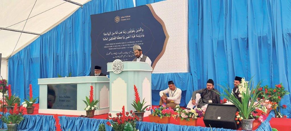 https://youtu.be/LHTSySbFavE ٭…نمازِ تہجد، عبادات نیز تربیتی، اخلاقی اور علمی موضوعات سے مزین تقاریر سے بھرپور روحانی ماحول ٭…ایک ہزار سے زائد احباب و خواتین کی شرکت ٭…دورانِ جلسہ تین سعید روحوں کی جماعت احمدیہ میں شمولیت اللہ تعالیٰ کے فضل سے جماعت احمدیہ فرانس کواپنا تیسواں جلسہ سالانہ مؤرخہ ۱۶،۱۵،۱۴ جولائی ۲۰۲۳ء کو اپنی جلسہ گاہ بمقام بیت العطاء میں منعقد کرنے کی توفیق ملی۔الحمدللہ علیٰ ذلک۔ پہلا دن ۱۴؍جولائی ۲۰۲۳ء ڈیڑھ بجے جمعہ اور نماز عصرکی ادا ئیگی کے بعد حضورانور کا خطبہ جمعہ سنا گیا۔چار بجے جلسہ سالانہ کی inspection ہوئی۔ جس کے بعد پرچم کشائی کی تقریب ہوئی۔ مکرم مشنری انچارج صاحب نے لوائے احمدیت جبکہ مکرم امیر صاحب جماعت فرانس نے فرانس کا جھنڈا لہرایا اور دعا کروائی۔ ساڑھے چار بجے افتتاحی اجلاس کا آغاز بصدارت مکرم امیر صاحب فرانس ہوا۔تلاوت قرآن کریم اور نظم کے بعدمکرم امیر صاحب نے ’’برکات خلافت‘‘ کے موضوع پر تقریر کی اور خلفاء کے اقتباسات کی روشنی میں بتایا کہ ہم کیا اعمال کریں کہ ہمیں خدا تعالیٰ خلافت کی برکات عطا فرماتا چلا جائے۔پھر ’’خدمت دین کو اک فضل الٰہی جانو‘‘ کے موضوع پر مکرم اسامہ احمدصاحب مربی سلسلہ فرانس اور ’’جہاد اکبر (مجاہدہ ٔنفس)‘‘ پر مکرم شیخ اسلم محمد جھمن صاحب نے تقریر کی۔آپ کی یہ تقریر بزبان فرنچ تھی۔ جلسہ سالانہ فرانس کی روایت ہے کہ کسی نو مبائع کو مدعو کیا جاتا ہے کہ وہ اپنا قبول احمدیت کا واقعہ بتائےتاکہ اس سے پرانے احمدیوں کے بھی ایمان تازہ ہوں۔اس سیشن میں درج ذیل تین نومبائعین نے مختصر تقاریر کیں۔ Host Selim، Host Rayan اورCoulibaly Mamadou۔ کھانے کے بعداردو کی دلچسپ سوال و جواب کی نشست ہوئی جس کے بعد نماز مغرب و عشاء جمع کر کے ادا کی گئیں۔ دوسرا دن ۱۵؍جولائی ۲۰۲۳ء دوسرے دن کا آغاز نماز تہجد،نماز فجر اور درس سے ہوا۔جس کے بعد احباب نے تلاوت کی۔ دوسرے روز کا پہلا اجلاس صبح ساڑھے دس بجےپرشروع ہوا۔اس اجلاس کی صدارت مکرم منصور احمد وینس صاحب نائب امیر و نیشنل سیکرٹری تربیت نے کی۔تلاوت اور نظم کے بعد مکرم سعید ہدوی صاحب نیشنل سیکرٹری نومبائعین نے مساجد کے آداب پر بزبان فرنچ، مکرم سعید چیمہ صاحب نیشنل سیکرٹری وصایا نے نظام وصیت اور موصیان کی ذمہ داری اور آخری تقریر خاکسا ر نے منافقین کے انجام کے موضوع پر کی۔ اس سیشن میں درج ذیل دو نومبائعین نے مختصر تقاریر کیں۔ Tawheddine Saïd اور Host Dorian اس اجلاس کے آخر پر مکرم امیر صاحب کی صدارت میں ایک وصیت سیمینار ہوا۔تلاوت کے بعدمکرم نیشنل سیکرٹری وصایا نے اس سیمینار کی اغراض بتائیں جس کے بعد مکرم مبلغ انچارج صاحب نے بھی موصیان کو نصائح کیں۔آخر پر مکرم امیر صاحب نے اختتامی کلمات کہے اور دعا کروائی۔اس کے بعدنمازوں اور کھانے کا وقفہ ہوا۔اس سیمینار کے بعددس شاملین جلسہ نے اس بابرکت تحریک میں شامل ہونے کی توفیق پائی اور چھ شاملین نے رسالہ الوصیت کے مطالعہ کے بعد وصیت کرنے کا وعدہ کیا ہے۔الحمد للہ علیٰ ذالک۔ جلسہ سالانہ کے تیسرے اجلاس کا آغازساڑھے چار بجے ہوا۔ اس اجلاس کی صدارت مکرم اسلم دوبوری صاحب نائب امیر و نیشنل سیکرٹری جائیداد نے کی۔اس سیشن میں تمام تقاریر فرنچ زبان میں تھیں۔تلاوت و نظم کے بعد مکرم عرفان ٹھاکر صاحب مربی سلسلہ نے تعلق باللہ کے طریق، مکرم Azouaou El Islamصاحب نے صداقت حضرت مسیح موعود ؑاور مکرم اطہر کاہلوں صاحب صدر جماعت سٹراسبرگ نے جلسہ سالانہ کے اغراض و مقاصد پرتقریر کی۔اس اجلاس میں مکرم Ichou Brahimنے اپنی قبولیت احمدیت کےبارےمیں احباب کو بتایا۔موصوف اپنی اہلیہ کے ساتھ احمدی ہوئے تھے۔ تیسرا دن ۱۶؍ جولائی ۲۰۲۳ء جلسہ کے تیسرے دن کاآغاز بھی نما ز تہجد،نماز فجر و درس کے بعد تلاوت قرآن کریم سے ہوا۔اختتامی اجلاس کا آغاز ساڑھے دس بجےپر امیر صاحب جماعت فرانس مکرم و محترم فہیم احمد نیاز صاحب کی صدارت میں ہوا۔ تلاوت ونظم کے بعد ایک نو مبائع Ndong Heviane Akoma نے اپنا سفر احمدیت بیان کیا۔ مکرم عطاء العلیم صاحب صدر جماعت لیوں نے بزبان فرنچ ’اسلامی پ