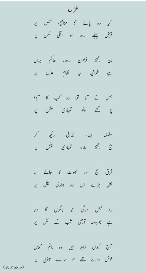کیا وہ پائے گا منافع، فصْل پر قرض پہلے سے ہو اگلی نسْل پر بن گئے فرعون سے، حاکِم یہاں ہے طمانچہ یہ نظامِ عدْل پر جس نے آنا تھا وہ کب کا آچکا پڑ گئے پتھر تمہاری عقْل پر سلسلہ اپنا، خدائی دیکھ کر بج گئے بارہ تمہاری شکْل پر فرق سچ اور جھوٹ کا جانے بِنا چل پڑے ہیں وہ ہماری نقْل پر رد نہیں ہوگی جو مانگوں گا دعا ہے بھروسہ آدھی شب کے نفْل پر آج کیوں زاہد ہیں وہ ماتم کناں خوش ہوئے تھے جو ہمارے قتْل پر (سید طاہر احمد زاہد)
