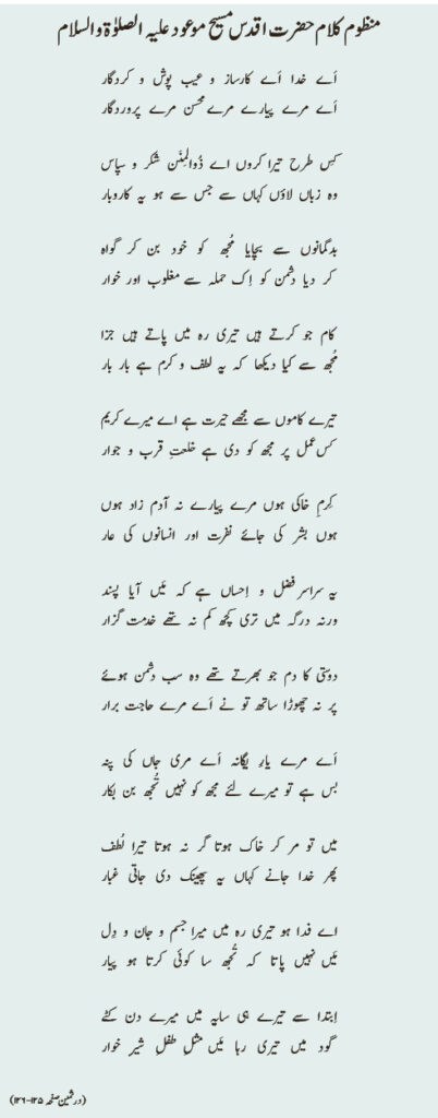 اَے خدا اَے کارساز و عیب پوش و کردگار اَے مرے پیارے مرے محسن مرے پروردگار کِس طرح تیرا کروں اے ذُوالمِنَن شکر و سپاس وہ زباں لاؤں کہاں سے جس سے ہو یہ کاروبار بدگمانوں سے بچایا مُجھ کو خود بن کر گواہ کر دیا دشمن کو اِک حملہ سے مغلوب اور خوار کام جو کرتے ہیں تیری رہ میں پاتے ہیں جزا مُجھ سے کیا دیکھا کہ یہ لطف و کرم ہے بار بار تیرے کاموں سے مجھے حیرت ہے اے میرے کریم کس عمل پر مجھ کو دی ہے خلعتِ قرب و جوار کِرمِ خاکی ہوں مرے پیارے نہ آدم زاد ہوں ہوں بشر کی جائے نفرت اور انسانوں کی عار یہ سراسر فضل و اِحساں ہے کہ مَیں آیا پسند ورنہ درگہ میں تری کچھ کم نہ تھے خدمت گزار دوستی کا دم جو بھرتے تھے وہ سب دشمن ہوئے پر نہ چھوڑا ساتھ تو نے اَے مرے حاجت برار اَے مرے یارِ یگانہ اَے مری جاں کی پنہ بس ہے تو میرے لئے مجھ کو نہیں تُجھ بن بکار میں تو مر کر خاک ہوتا گر نہ ہوتا تیرا لُطف پھر خدا جانے کہاں یہ پھینک دی جاتی غبار اے فدا ہو تیری رہ میں میرا جسم و جان و دِل مَیں نہیں پاتا کہ تُجھ سا کوئی کرتا ہو پیار اِبتدا سے تیرے ہی سایہ میں میرے دن کٹے گود میں تیری رہا مَیں مثلِ طفلِ شیر خوار (در ثمین صفحہ ۱۲۵-۱۲۶)