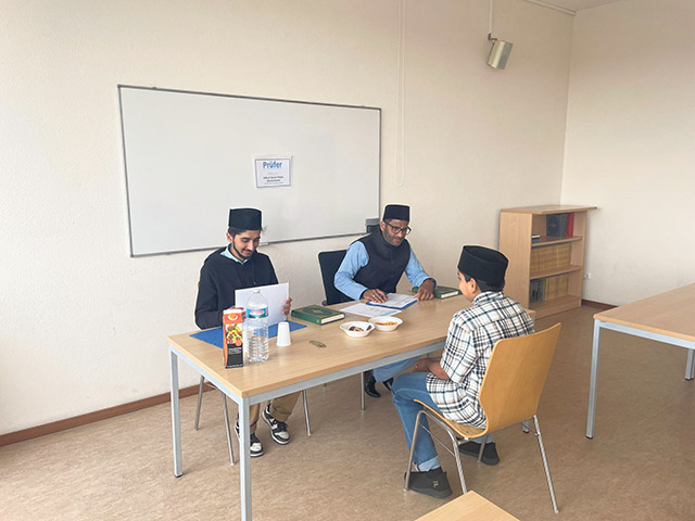 https://youtu.be/7Vlpt5c8Ops اللہ تعالیٰ کے فضل سے جرمنی میں جولائی ۲۰۱۷ء میں شعبہ تعلیم کےزیر انتظام حفظ القرآن کلاس کا آغاز ہوا اور جون ۲۰۲۰ء سے سیدنا حضرت خلیفة المسیح الخامس ایدہ اللہ تعالیٰ بنصرہ العزیز کی ہدایت کے تحت شعبہ تعلیم القرآن و وقف عارضی جماعت جرمنی کے زیر انتظام یہ کلاس جاری ہے۔ حفظ القرآن کلاس جرمنی میں ہر سال نئے بچوں کے داخلے سے ایک نئی کلاس شروع ہو جاتی ہے۔ اس طرح امسال اللہ تعالیٰ کے فضل سے چھٹی کلاس حفظ کی شامل ہوئی۔ جرمنی میں بچے سکول کی تعلیم کے ساتھ ساتھ شام کو حفظ کی آن لائن ویڈیو کلاسز بھی لیتے ہیں اور اس لحاظ سے کافی محنت کررہے ہیں۔اللہ تعالیٰ ان کی توفیق میں اضافہ اور برکت عطا فرمائے۔ آمین بہترین کارکردگی اور بچوں کی راہنمائی کے لیے انتظامیہ حفظ القرآن کلاس کا بھی ایک اہم کردار ہے۔اس سلسلہ میں ہر کلاس کا ایک انچارج مقرر ہے نیز نگران داخلہ جات، نگران امتحانات،نگران آئی ٹی، نگران اساتذہ، نگران ریکارڈ، نگران ترتیل القرآن اور دیگر شعبہ جات حفظ القرآن کلاس جرمنی میں خدمات کی توفیق پا رہے ہیں۔ ان شعبہ جات کی مجموعی نگرانی کی ذمہ داری انچارج و نائب انچارج حفظ القرآن کلاس کے سپرد ہے۔ حفظ القرآن کلاس جرمنی میں ۷۱؍ طلبہ ساٹھ اساتذہ کی زیرنگرانی قرآن حفظ کرنے کی توفیق پارہے ہیں۔ الحمدللہ۔ اساتذہ کرام کی اکثریت مربیان سلسلہ اور حفاظ کرام پر مشتمل ہے۔اسی طرح بچوں کی رہائش کے قریب ترین مقامی مربیان سلسلہ بھی مدد کر رہے ہیں۔ کلاس انچارج صاحبان کا مستقل رابطہ والدین اور بچوں سے رہتا ہے تاکہ بروقت راہنمائی کی جاسکے نیز والدین سے ماہانہ میٹنگز کا انعقاد بھی کیا جاتا ہے۔ علاوہ ازیںدورانِ سال مختلف سیمینارز بھی منعقد کیے جاتے ہیں جن میں مربیان کرام کو والدین سے حفظ القرآن وتعلیم القرآن کے موضوع پر تقریر کی دعوت دی جاتی ہے۔ ان سیمینارز میں بچوں کی صحت و تندرستی کے لیے ڈاکٹر صاحبان بھی والدین کی راہنمائی کرتے ہیں۔ حفظ القرآن کلاس جرمنی سے تکمیل حفظ کرنے والے حفاظ پہلا بچہ جس نے اللہ تعالیٰ کے فضل سے حفظ القرآن کلاس جرمنی سے تکمیلِ حفظ کی توفیق پائی عزیزم محمد ذکی اللہ ضیاء ولد حافظ محمد ظفر اللہ صاحب ہے۔ عزیزم ۱۷؍ جولائی ۲۰۱۷ء کو بعمر نوسال سات ماہ حفظ کلاس میں داخل ہوا۔ اور ۶؍ مئی ۲۰۲۲ء بعمر ۱۴؍ سال پانچ ماہ حفظ مکمل کرنےکی توفیق پائی۔ کل عرصہ حفظ کا چارسال اور تقریباً دس ماہ ہے۔بارک اللہ لکم دوسرا بچہ عزیزم محمد عثمان احمد ولد فاروق احمد عمر صاحب ۱۷؍ جولائی ۲۰۱۷ء بعمر آٹھ سال نو ماہ حفظ القرآن کلاس جرمنی میں داخل ہوا۔ اور تیرہ سال سات ماہ کی عمر میں ۱۸؍ جون ۲۰۲۲ء کو یعنی چار سال اور تقریباً گیارہ ماہ میں تکمیل حفظ القرآن کی توفیق پائی۔ بارک اللہ لکم امسال ۲۰۲۳ء میں بھی الحمدللہ دو طلبہ عزیزم ساحل ادریس اور عزیزم تحسین محمود نے حفظ مکمل کرنے کی توفیق پائی۔ سالانہ امتحانات ۲۰۲۳ء بچوں کے پراگریس اور حفظ کے معیار کے جائزہ کے لیے علاوہ دیگر اقدامات کے سالانہ امتحانات کا انعقاد کیا جاتا ہے۔ امسال حفظ القرآن کلاس جرمنی کے سالانہ امتحانات مورخہ ۳۱؍ جولائی تا ۴؍ اگست ۲۰۲۳ء جامعہ احمدیہ جرمنی میں منعقد کیے گئے۔ تیاری: ماہ اپریل میں نیشنل سیکرٹری تعلیم القرآن و وقف عارضی حافظ قدرت اللہ صاحب سے امتحان کمیٹی کی منظوری لی گئی تاہم امتحانات کے لیے سافٹ ویئر، بچوں کے حفظ کردہ سیپاروں کا ریکارڈ وغیرہ کا کام فروری سے ہی جاری تھا۔ متعدد میٹنگز کمیٹی اور والدین کے ساتھ بھی تیاری اور پلاننگ کا اہم حصہ تھیں۔مکرم پرنسپل صاحب جامعہ احمدیہ جرمنی سے جامعہ کی عمارت میں امتحانات منعقد کرنے کی اجازت لینے کے بعد مختلف شعبہ جات میں مدد کے لیے لوکل امیر صاحب Riedstadt سے درخواست کی گئی۔ اس سلسلہ میں لوکل امارت Riedstadt کے احبابِ جماعت خصوصاً صدر صاحب حلقہ Godelau Nord اور ان کی ٹیم نے بہت محنت اور وقت کی قربانی سے مدد کی۔ جزاہم اللہ تعالیٰ احسن الجزاء جامعہ احمدیہ میں ۴۸؍ طلبہ کے مجموعی طور پر۲۴۵؍ حفظ کردہ پاروں کا امتحان