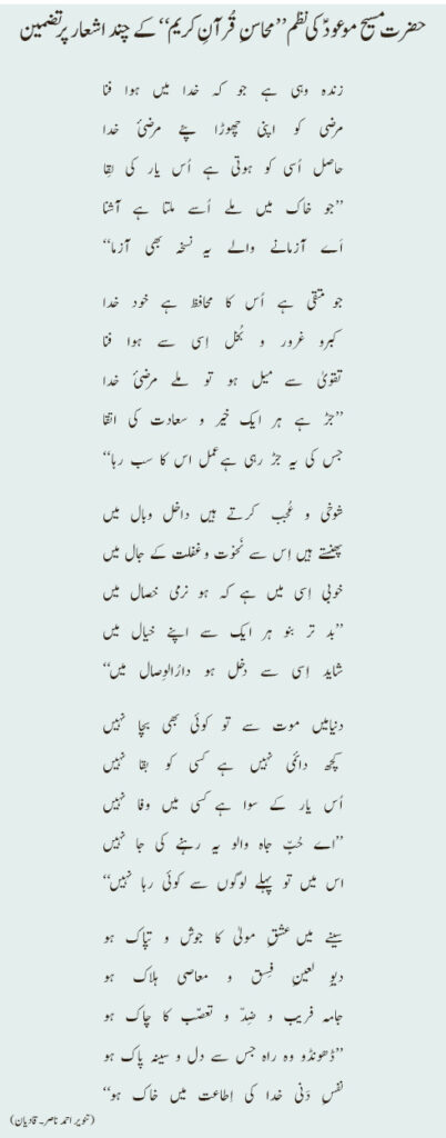 زندہ وہی ہے جو کہ خدا میں ہوا فنا مرضی کو اپنی چھوڑا پئے مرضیٔ خدا حاصل اُسی کو ہوتی ہے اُس یار کی لِقا ’’جو خاک میں ملے اُسے ملتا ہے آشنا اَے آزمانے والے یہ نسخہ بھی آزما‘‘ جو متقی ہے اُس کا محافظ ہے خود خدا کبرو غرور و بُخل اِسی سے ہوا فنا تقویٰ سے میل ہو تو ملے مرضیٔ خدا ’’جڑ ہے ہر ایک خیر و سعادت کی اتقا جس کی یہ جڑ رہی ہے عمل اس کا سب رہا‘‘ شوخی و عُجب کرتے ہیں داخل وبال میں پھنستے ہیں اِس سے نَخوت و غفلت کے جال میں خوبی اِسی میں ہے کہ ہو نرمی خصال میں ’’بد تر بنو ہر ایک سے اپنے خیال میں شاید اِسی سے دخل ہو دارُالوِصال میں‘‘ دنیامیں موت سے تو کوئی بھی بچا نہیں کچھ دائمی نہیں ہے کسی کو بقا نہیں اُس یار کے سوا ہے کسی میں وفا نہیں ’’اے حُبِّ جاہ والو یہ رہنے کی جا نہیں اس میں تو پہلے لوگوں سے کوئی رہا نہیں‘‘ سینے میں عشقِ مولیٰ کا جوش و تپاک ہو دیوِ لعینِ فِسق و معاصی ہلاک ہو جامہ فریب و ضِدّ و تعصّب کا چاک ہو ’’ڈھونڈو وہ راہ جس سے دل و سینہ پاک ہو نفسِ دَنی خدا کی اِطاعت میں خاک ہو‘‘ (تنویر احمد ناصر۔ قادیان)