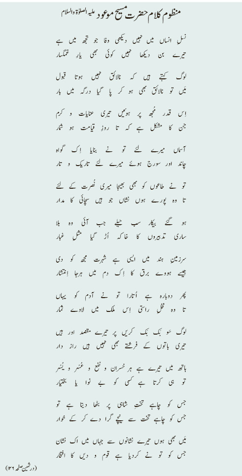 نسلِ انساں میں نہیں دیکھی وفا جو تجھ میں ہے تیرے بن دیکھا نہیں کوئی بھی یارِ غمگسار لوگ کہتے ہیں کہ نالائق نہیں ہوتا قبول مَیں تو نالائق بھی ہو کر پا گیا درگہ میں بار اِس قدر مُجھ پر ہوئیں تیری عنایات و کرم جن کا مشکل ہے کہ تا روزِ قیامت ہو شمار آسماں میرے لئے تو نے بنایا اِک گواہ چاند اور سورج ہوئے میرے لئے تاریک و تار تو نے طاعوں کو بھی بھیجا میری نُصرت کے لئے تا وہ پورے ہوں نشاں جو ہیں سچائی کا مدار ہو گئے بیکار سب حیلے جب آئی وہ بلا ساری تدبیروں کا خاکہ اُڑ گیا مثلِ غبار سرزمینِ ہند میں ایسی ہے شہرت مجھ کو دی جیسے ہووے برق کا اِک دم میں ہرجا اِنتشار پھر دوبارہ ہے اُتارا تو نے آدم کو یہاں تا وہ نخلِ راستی اِس ملک میں لاوے ثمار لوگ سَو بَک بَک کریں پر تیرے مقصد اور ہیں تیری باتوں کے فرشتے بھی نہیں ہیں راز دار ہاتھ میں تیرے ہے ہر خسران و نفع و عُسْر و یُسْر تو ہی کرتا ہے کسی کو بے نوا یا بختیار جس کو چاہے تختِ شاہی پر بٹھا دیتا ہے تو جس کو چاہے تخت سے نیچے گرا دے کر کے خوار مَیں بھی ہوں تیرے نشانوں سے جہاں میں اک نشان جس کو تو نے کردیا ہے قوم و دیں کا افتخار (در ثمین صفحہ ۱۲۶)